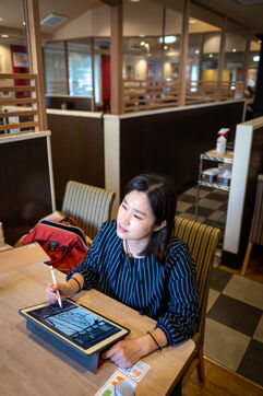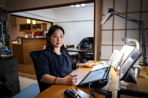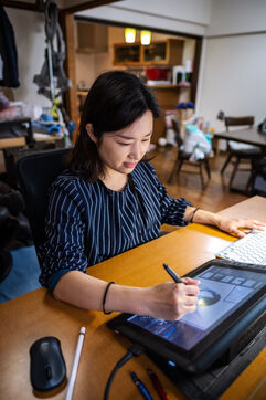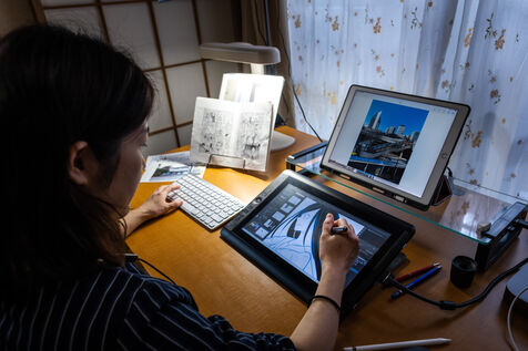 Ryo makes Shonen manga, a style traditionally intended for boys, with fights and action. She published her first manga at the age of 21 after winning a contest. After having tackled themes like ninjas and music, Ryo is now working on the theme of Japanese doors in horror stories. Doors that move, doors that live...stories that are scary. Her inspiration comes from her experiences, her imagination and other manga. She doesn't hesitate to document herself in order to make her stories more plausible and rich. Her settings often come from her neighborhood, Kawaguchi, in which she likes to walk and take pictures with her smartphone to then get inspired. For example, one of her illustrations shows the facade of her elementary school, which she recently photographed to include in her manga.
