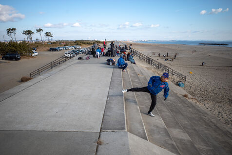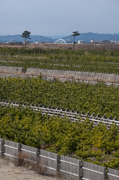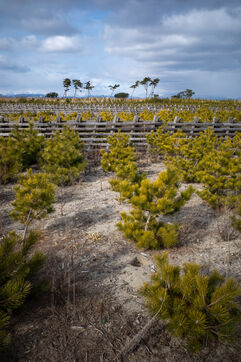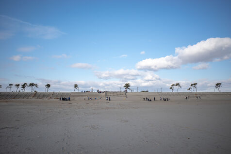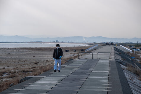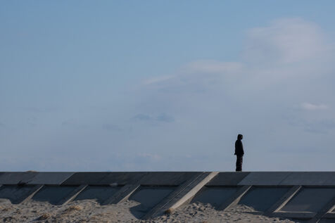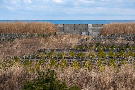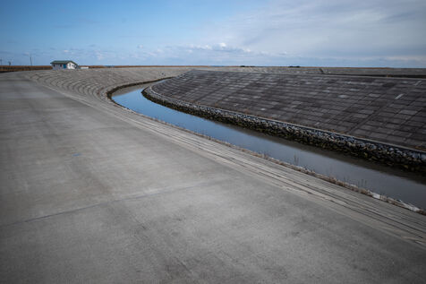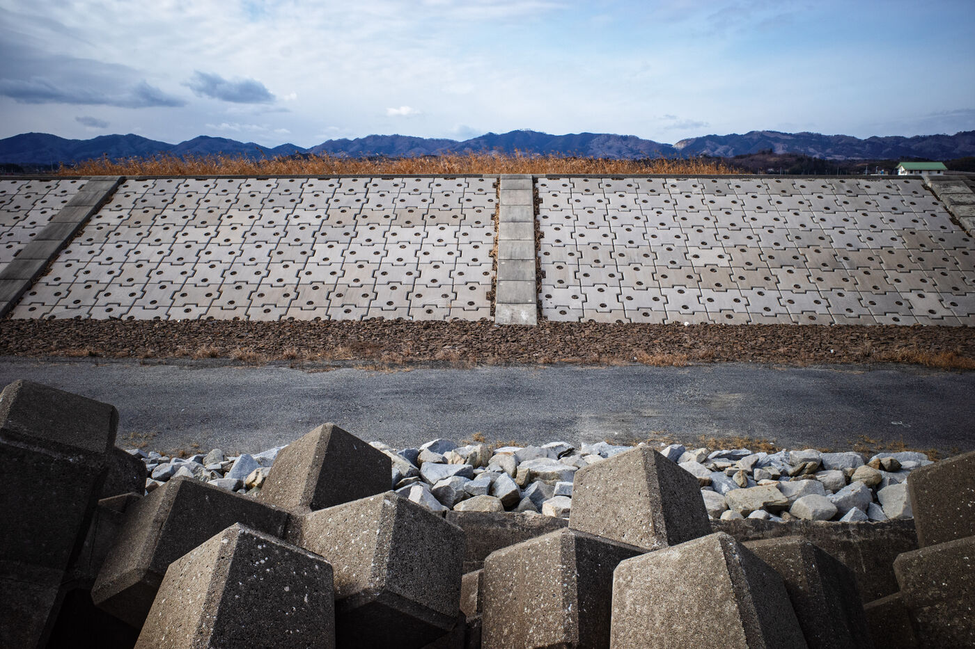 C'est une véritable muraille de béton qui se dresse désormais sur la totalité du littoral de la baie de Sendai ainsi que sur les côtes du Nord-Est. La réaction des autorités japonaises à la catastrophe de 2011, qui a couté la vie de près de 20,000 personnes, fut de déverser une quantité faramineuse de béton le long des côtes. Les digues construites font entre 5 et 15 mètres de hauteur. Elles sont censées protéger les habitants des plaines basses de l'avancée de la mer en cas de tsunami, ou du moins, ralentir sa course pour permettre aux personnes d'évacuer en terrain sûr. Au délà de l'efficacité discutable d'une telle proposition, c'est tout une organisation géographique et mentale qui est chamboulée. Les liens entre terres et mer sont détruits, les estuaires et embouchures de rivières sont désormais endigués, barrés purement et simplement par les ouvrages colossaux. Ce déchainement s'est fait au profit des entreprises de btp japonaises, grandes gagnantes de ce remaniement des cartes. Les habitants doivent quant à eux apprendre à vivre sans pouvoir regarder la mer comme ils avaient l'habitude de le faire.