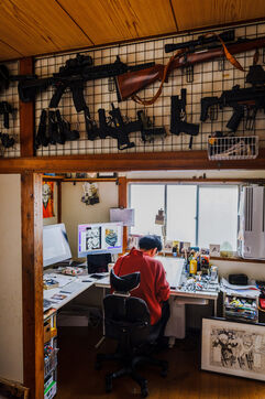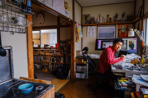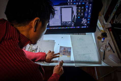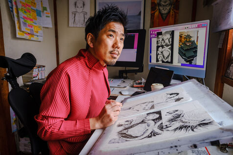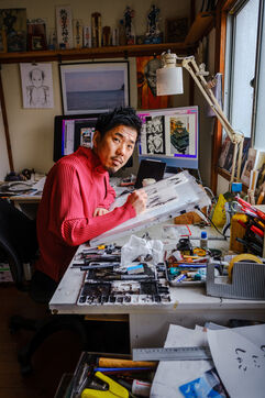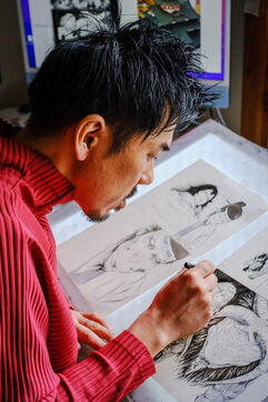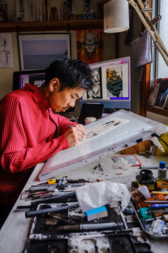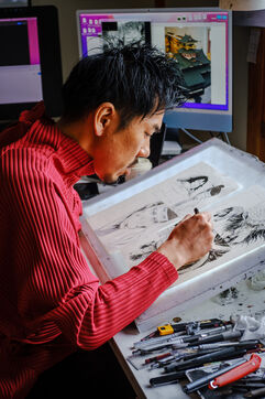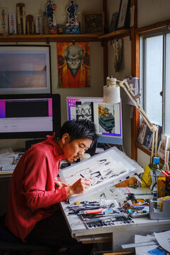 Il travaille toujours de manière analogique, avec des crayons et de l'encre, puis il numérise et termine son processus de création de manière numérique. Pour l'aider, Todo a 3 assistants.