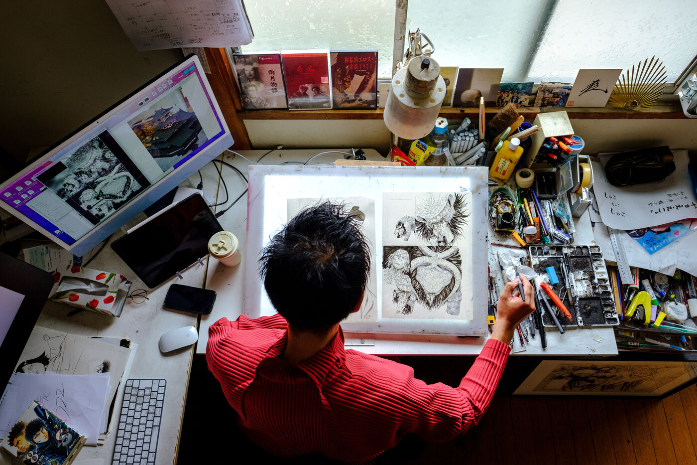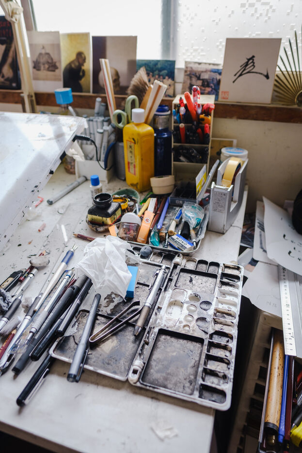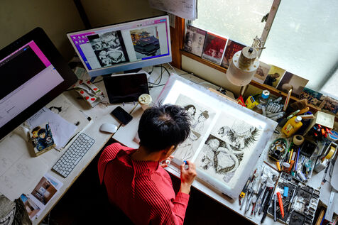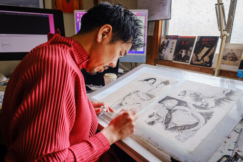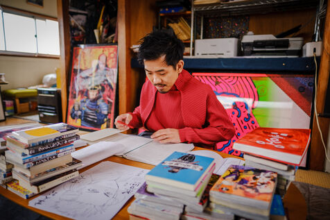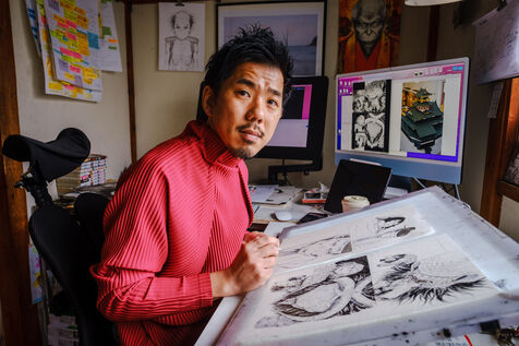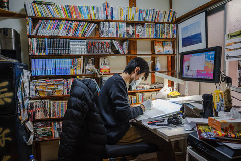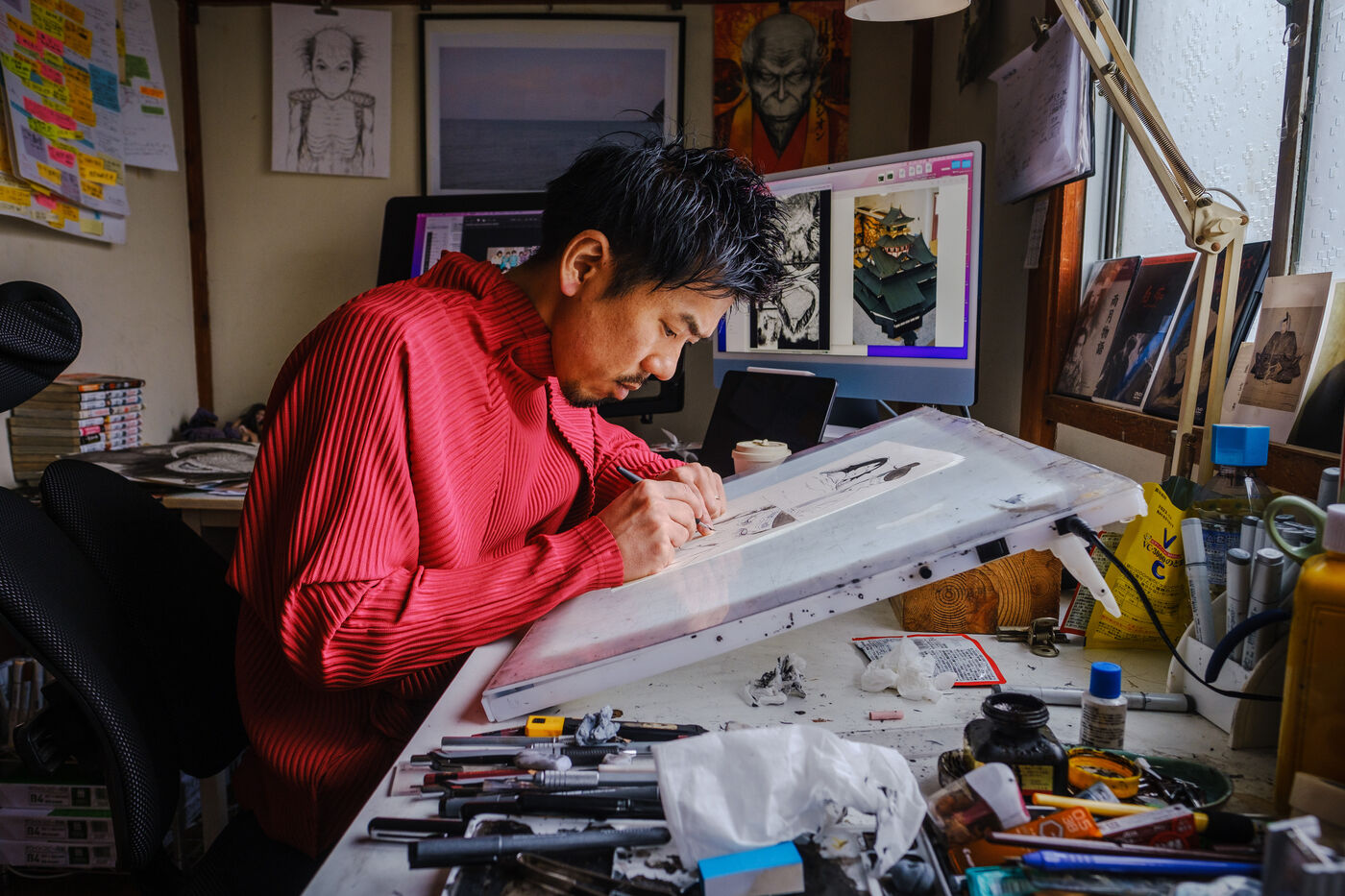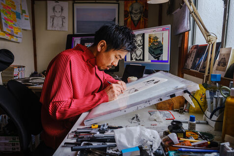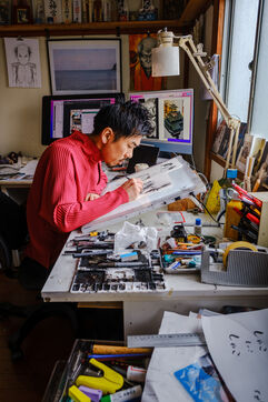 He always works in an analog way, with pencils and ink, and then he digitizes and finishes his creative process in a digital way. To help him, Todo has 3 assistants.