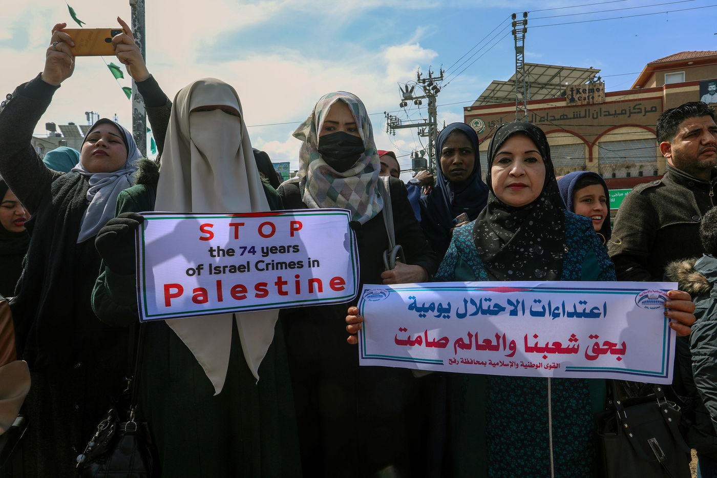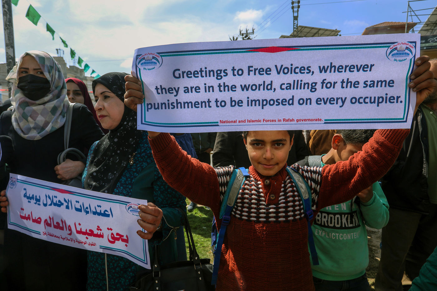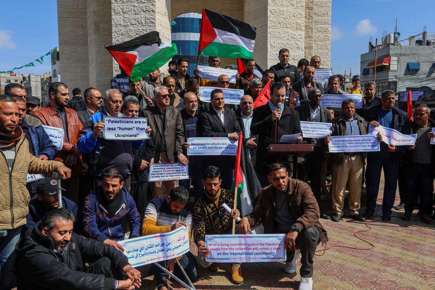 RAFAH, GAZA STRIP - MARCH 07. The national and Islamic forces factions join the march rejecting and denouncing double standards and double standards in the West in dealing with our Palestinian cause and rights and condoning the crimes of the Israeli occupation that has been going on for 74 years, and as it demands all countries of the world to stand by the Palestinian cause, similar to what was presented to the Ukrainians against Russia. In the Rafah refugee camp in the southern Gaza Strip, on March 7, 2022.