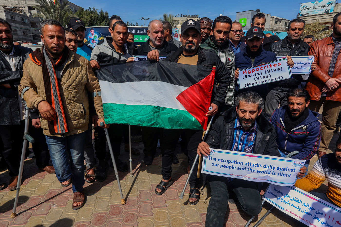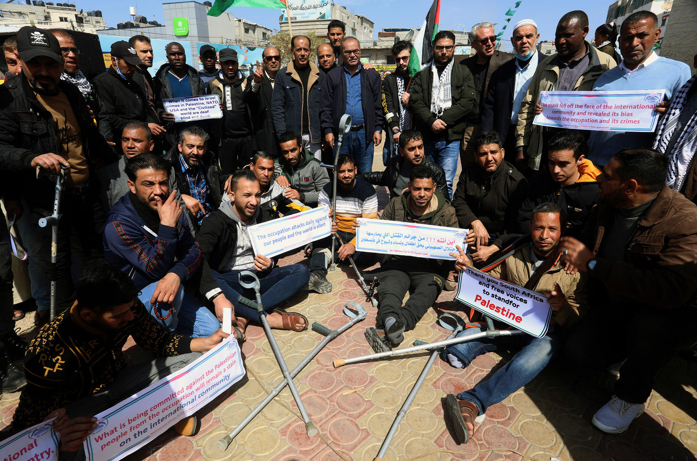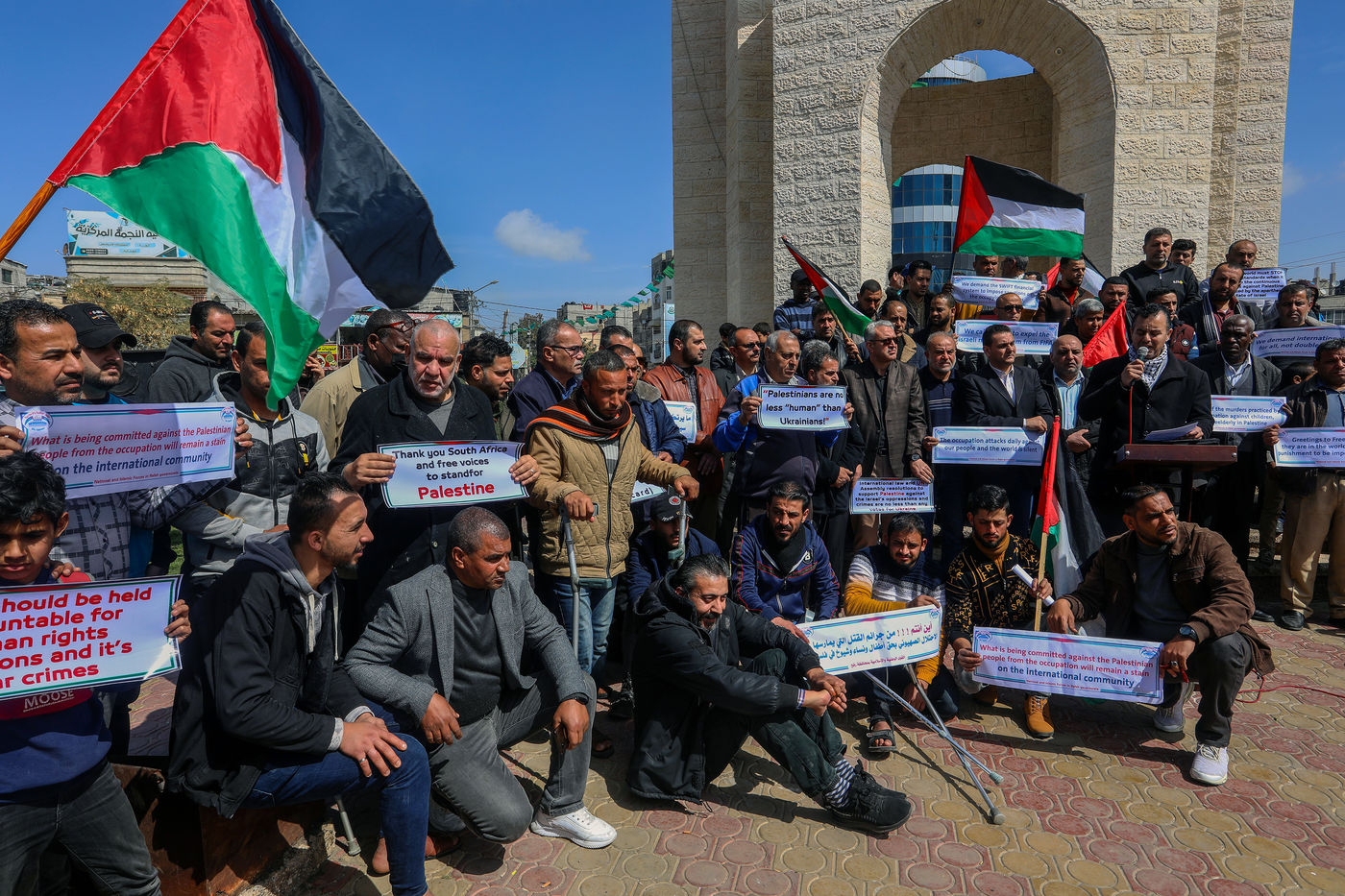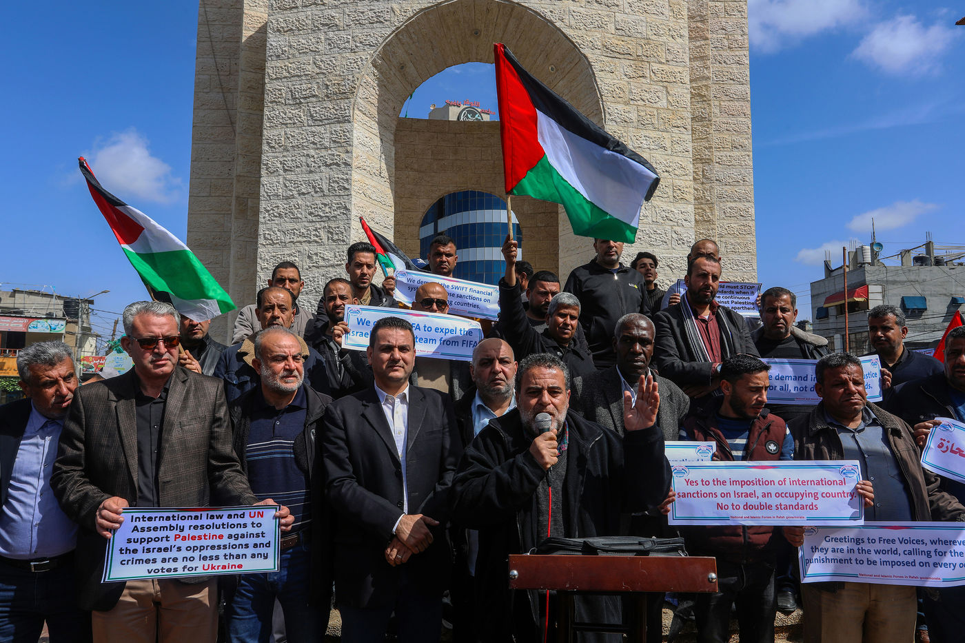 RAFAH, GAZA STRIP - MARCH 07. The national and Islamic forces factions join the march rejecting and denouncing double standards and double standards in the West in dealing with our Palestinian cause and rights and condoning the crimes of the Israeli occupation that has been going on for 74 years, and as it demands all countries of the world to stand by the Palestinian cause, similar to what was presented to the Ukrainians against Russia. In the Rafah refugee camp in the southern Gaza Strip, on March 7, 2022.
