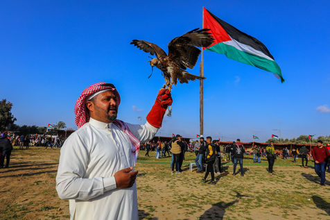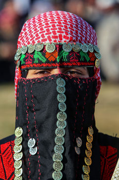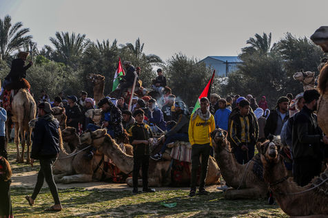 Deir al-Balah, GAZA STRIP - MARCH 27. Palestinian Bedouins take part in a commemoration of Land Day in Deir al-Balah camp in the central Gaza Strip, March 27, 2022. Land Day marks an incident in 1976 when Israeli forces shot and killed six people during protests against land confiscation. Photograph by Abed Rahim Mohammed / Hans Lucas.