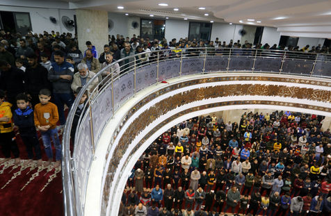 RAFAH, GAZA STRIP - APRIL 02. Muslim worshippers perform the first evening Tarawih prayer on the first night of the holy fasting month of Ramadan, at the Great Al-Awda Mosque in the city of Rafah in the southern Gaza Strip, on April 2, 2022.