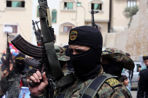 KHAN YOUNES, GAZA STRIP - APRIL 08. Supporters of Hamas and Islamic Jihad take part in a rally to celebrate the shooting attacks in Israel, in the southern Gaza Strip, on April 8, 2022. Palestinians celebrate the shooting attacks in Tel Aviv, Israel.