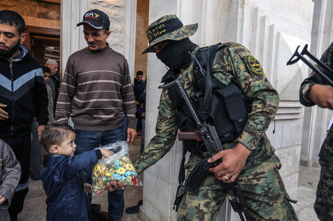 Al-Qassam Brigades members distribute sweets after the end of the Eid al-Fitr prayer