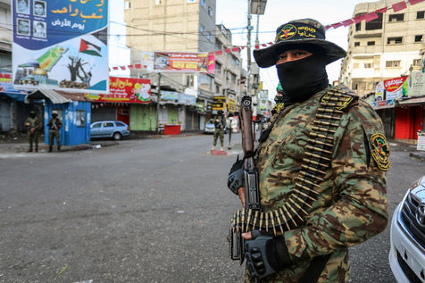 RAFAH, GAZA STRIP - MAY 02. Masked members of the Al-Qassam Brigades, the military wing of Hamas, and Al-Quds Brigades, the military wing of the Islamic Jihad, distributing sweets to people after the end of the Eid al-Fitr prayer marking the end of the holy fasting month of Ramadan. In the Rafah refugee camp in the southern Gaza Strip, on May 2, 2022.