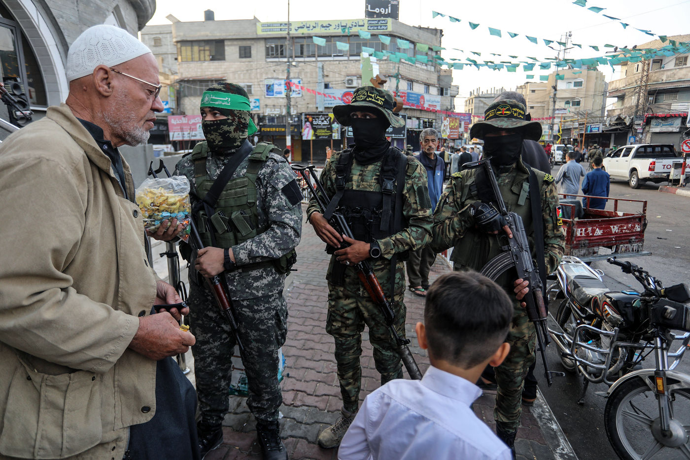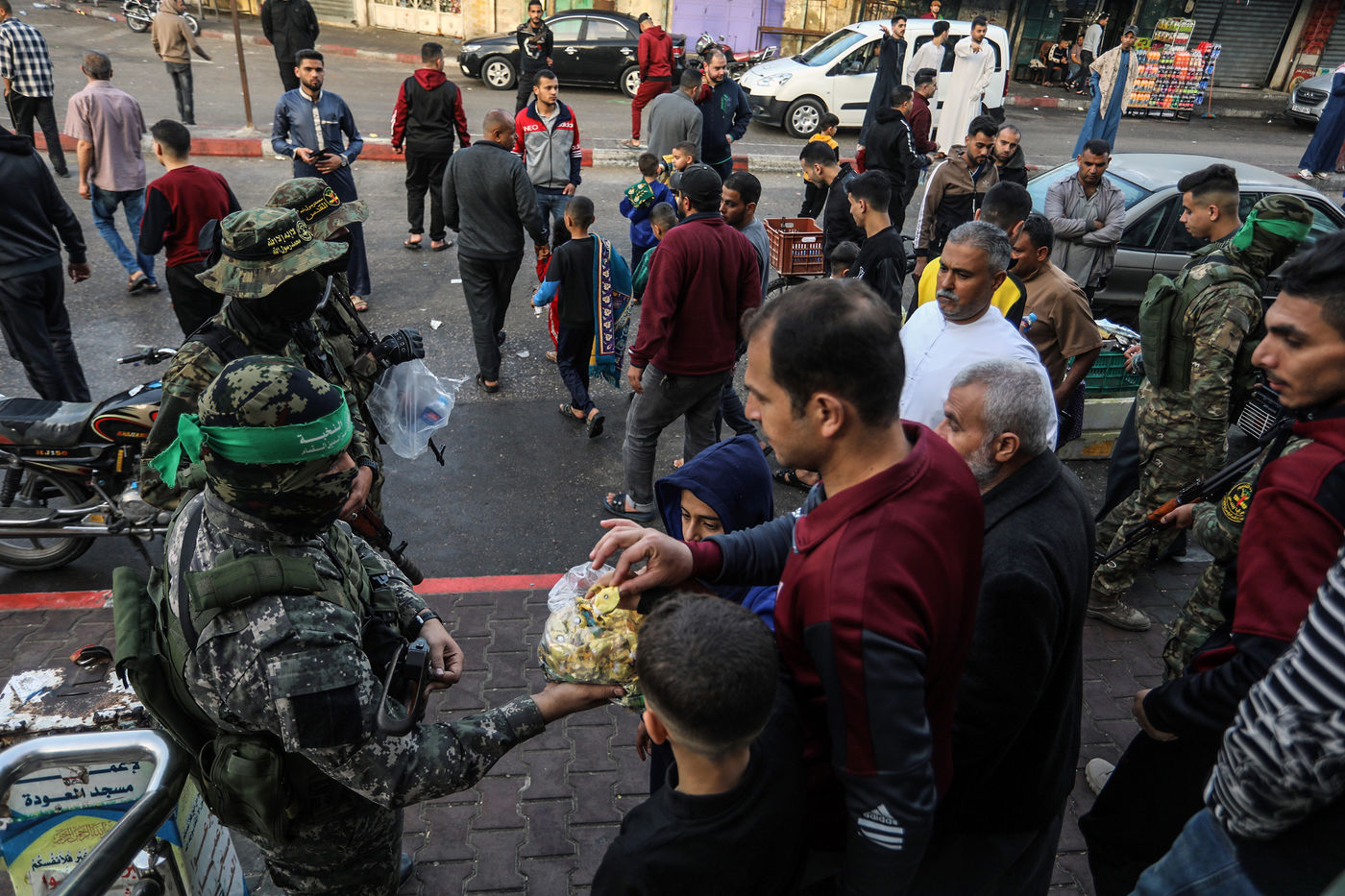 Des membres des Brigades Al-Qassam distribuent des bonbons après la fin de la prière de l'Aïd al-Fitr
