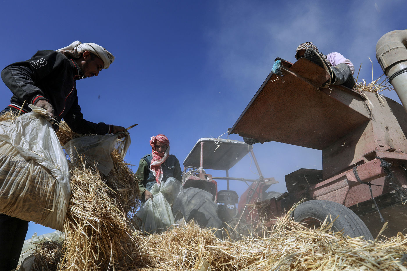 DES AGRICULTEURS PALESTINIENS RÉCOLTENT DU BLÉ PENDANT LA SAISON ANNUELLE DES MOISSONS
