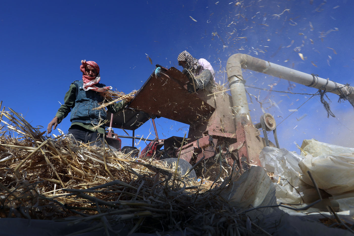 RAFAH, GAZA STRIP - MAY 08. Palestinian farmers harvest wheat during the annual harvest season near the border between Israel and Gaza in Rafah, southern Gaza Strip, on May 8, 2022. Palestinians begin harvesting wheat at the beginning of the season for export.