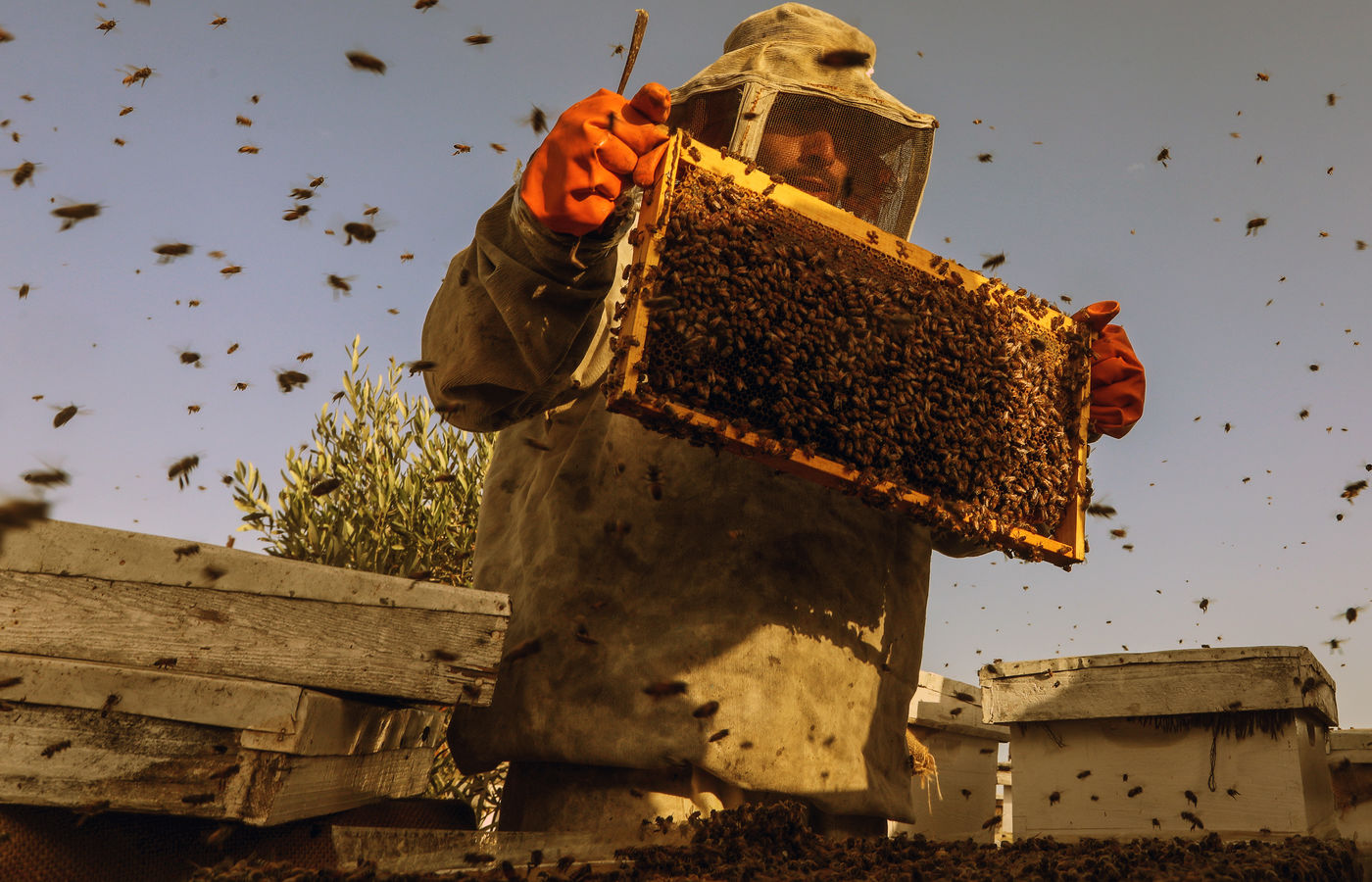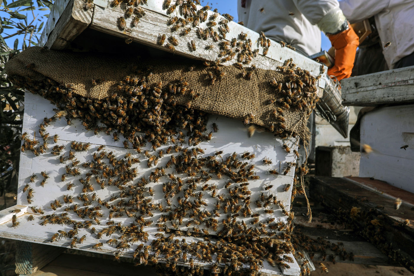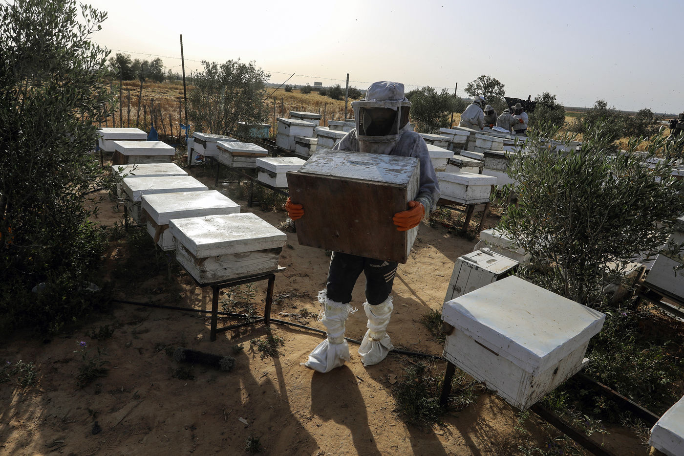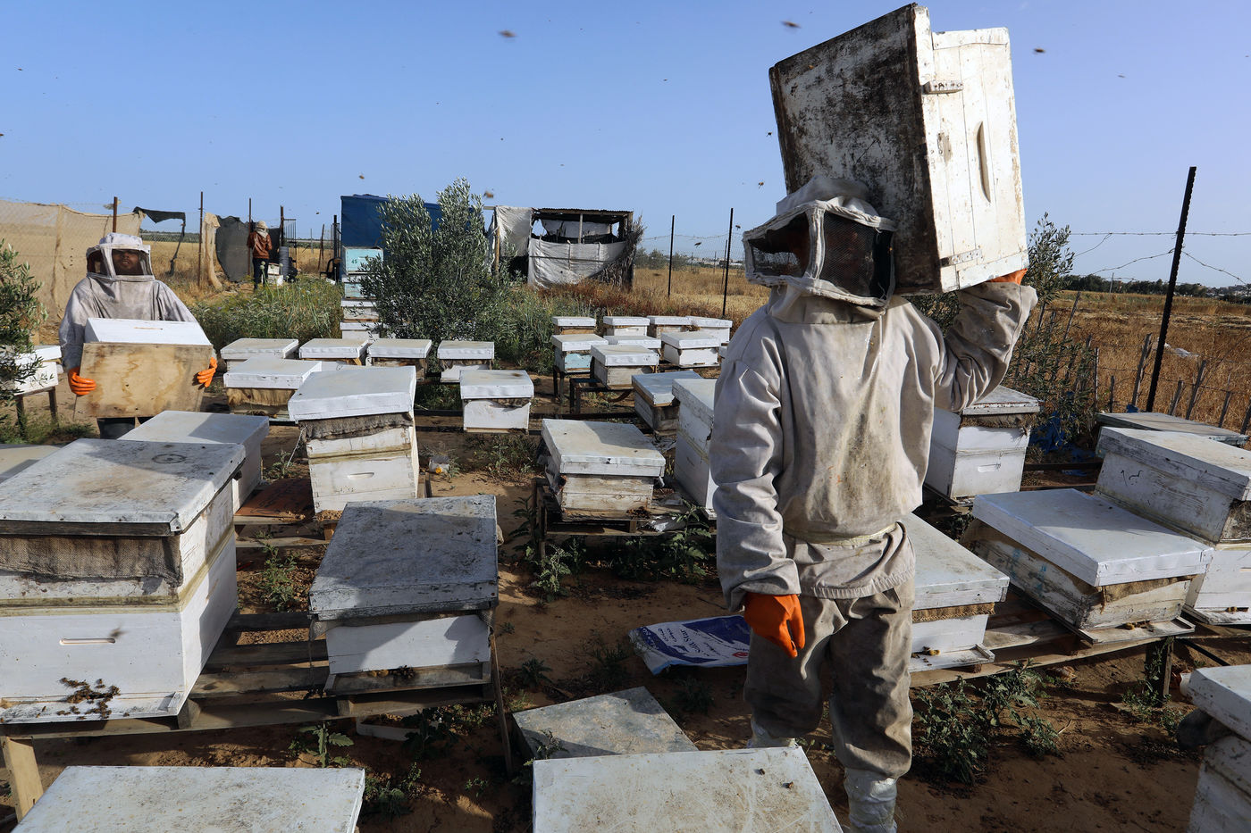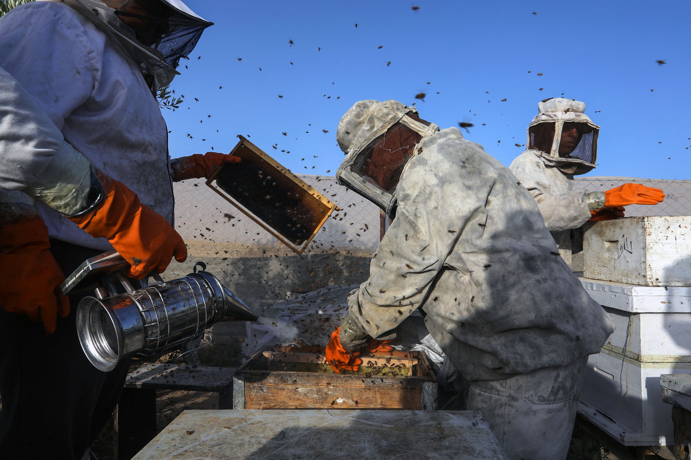 KHAN YUNIS, GAZA STRIP - MAY 09. Palestinian beekeepers collect honey from the beehives of the apiary during the annual harvest season near the Israel-Gaza border in the east of the town of Khan Yunis in the southern Gaza Strip, on May 9, 2022.