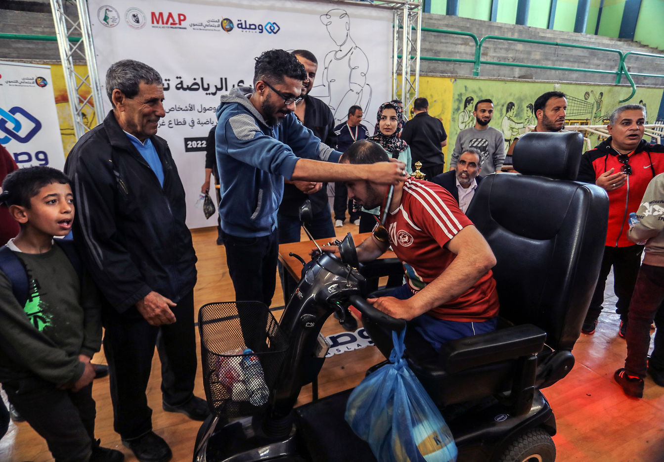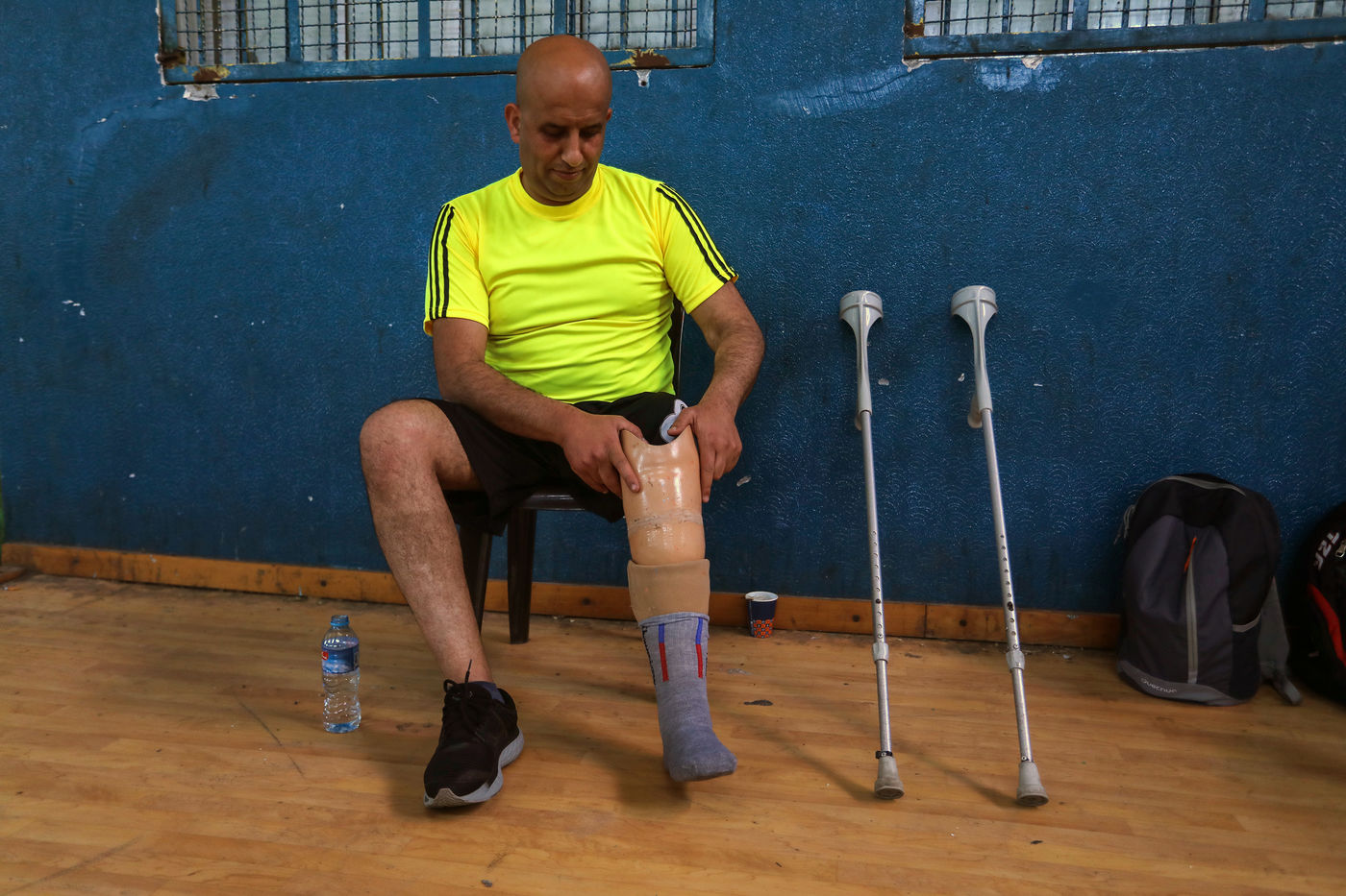 RAFAH, BANDE DE GAZA - 12 MAY. Des Palestiniens organisent un match de "volley-ball assis" pour les personnes à mobilité réduite et amputées au club des services sportifs de Rafah. Dans la ville de Rafah, dans le sud de la bande de Gaza, le 12 mai 2022.