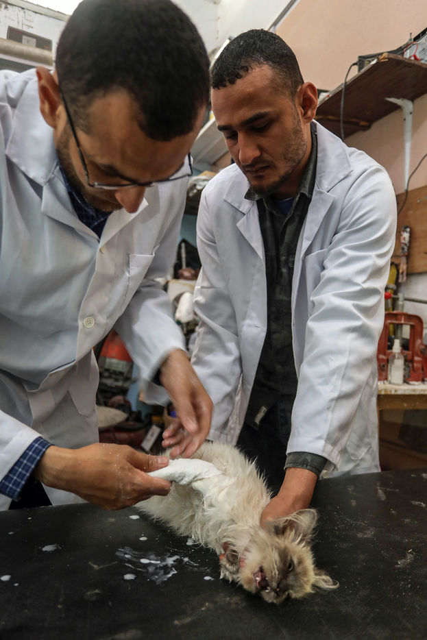 RAFAH, GAZA STRIP - MAY 23. Palestinian Dr. Muhammad al-Khalidi, a Jabour (orthopedic) specialist, and the sister of Eng. Yousef al-Khalidi, an animal veterinarian, and for the first time in the Gaza Strip, open a clinic to take care of animals and birds from fractures. There are their care of treatment and redress of fractures. In the city of Rafah in the southern Gaza Strip, on May 23, 2022.