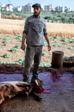 Les propriétaires d'un mouton qui ne souhaitent pas procéder au sacrifice eux-mêmes l'apportent au fermier Jadallah qui fera procéder à l'égorgement tout en priant Dieu et en faisant en sorte que le mouton ne voie pas le couteau.
