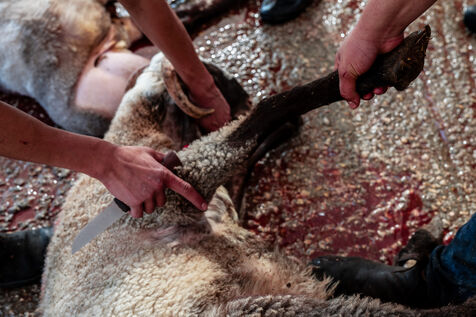 Sheep owners who do not wish to perform the sacrifice themselves bring it to the farmer, Jadallah, who will have the slaughter performed while praying to God and ensuring that the sheep do not see the knife.