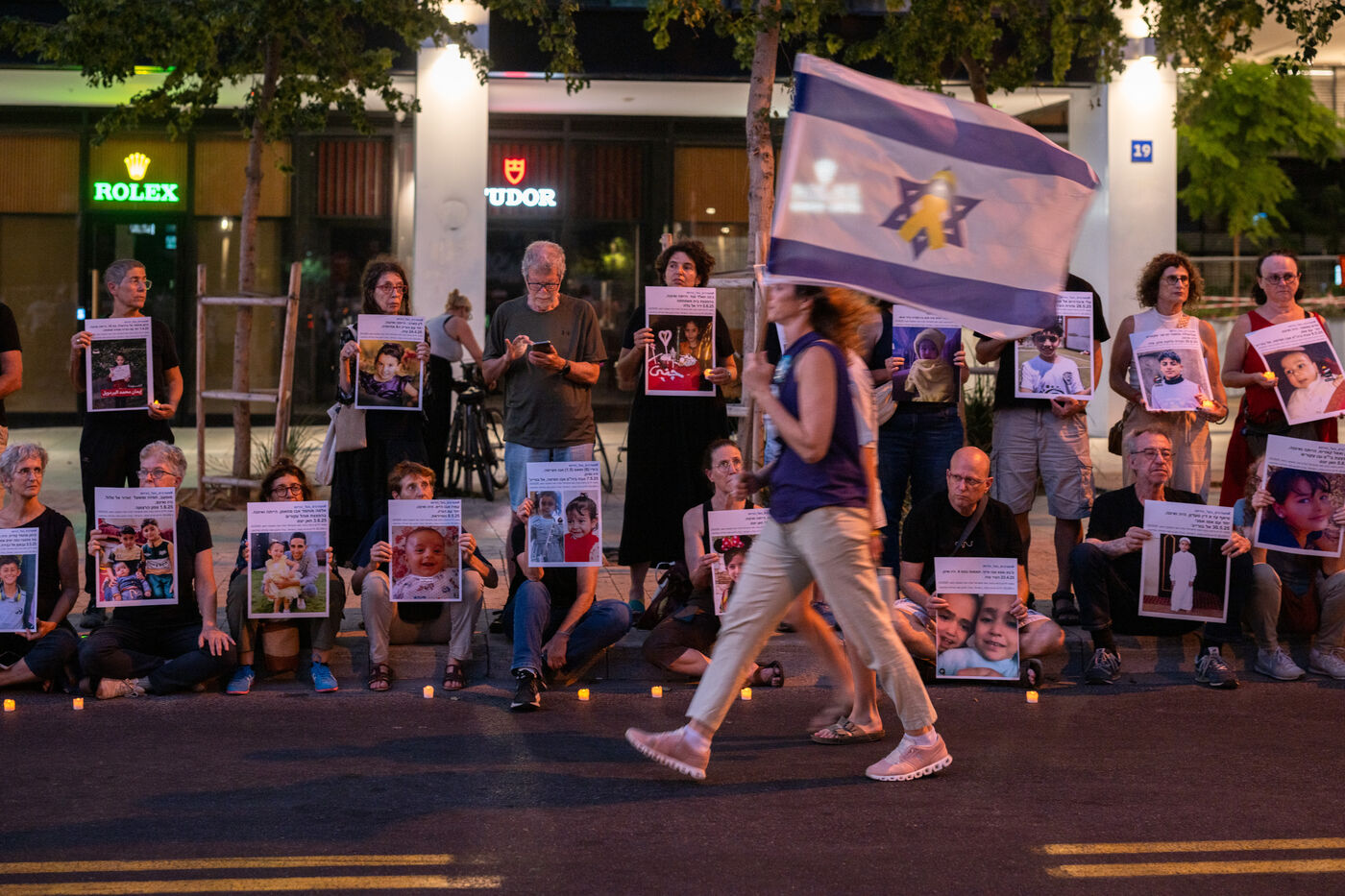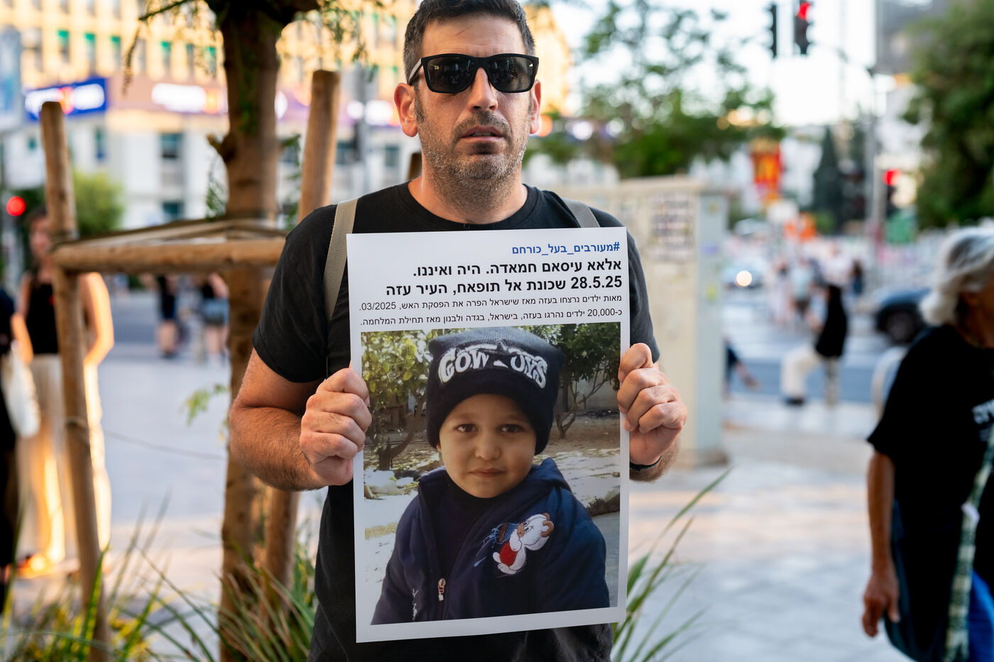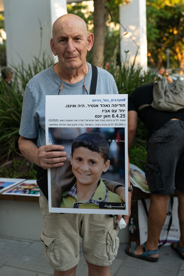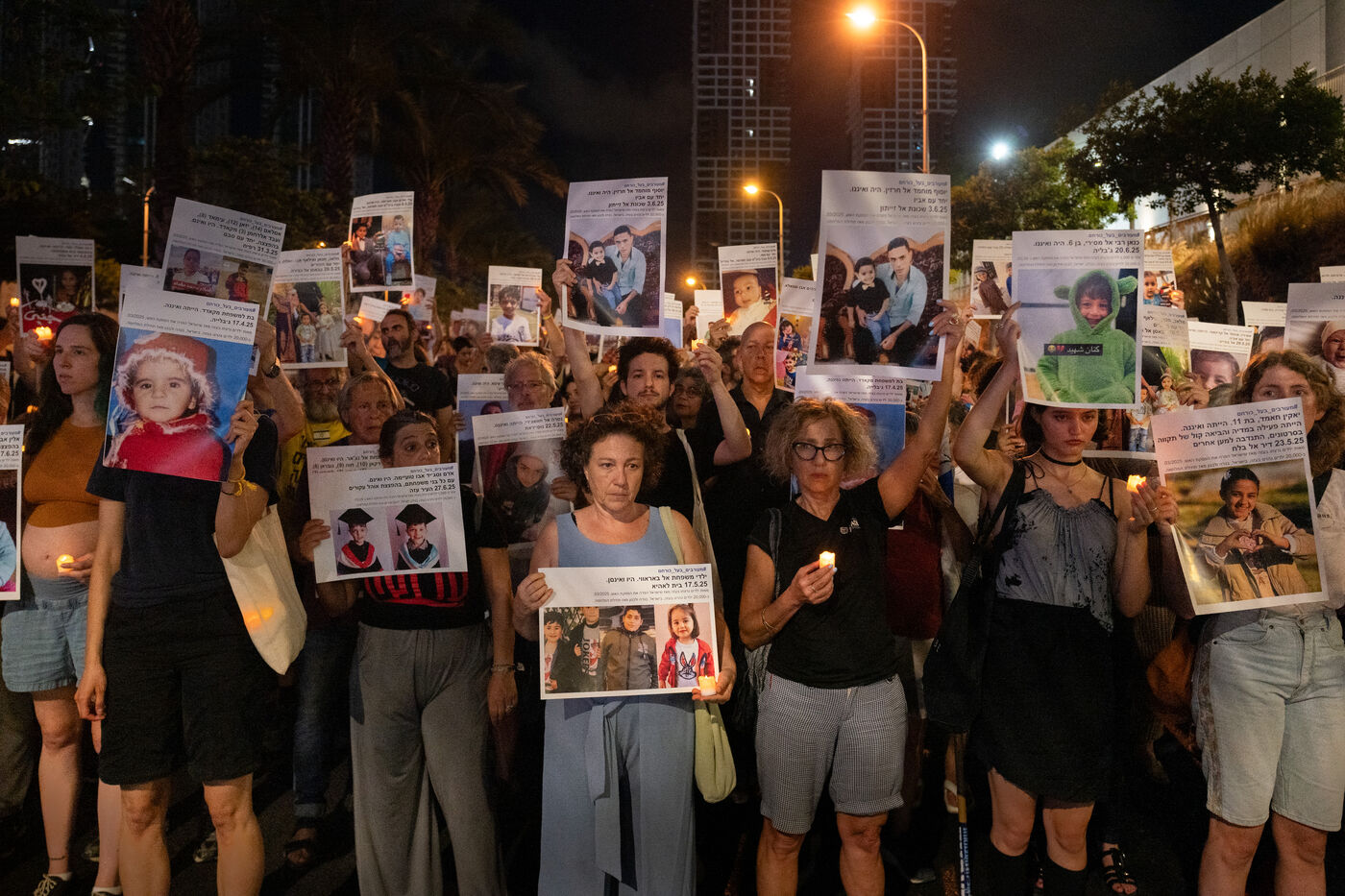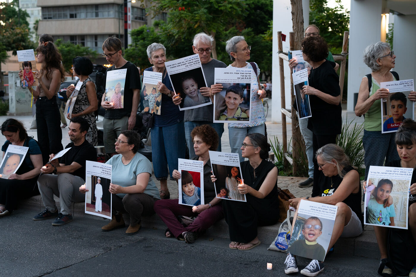 Hundreds of Israelis opposing war stand and sit in the street in a silent and peaceful action, showing photos of Palestinian children from Gaza and the West Bank killed since Israel broke the ceasefire in March 2025, as new ceasefire negotiations are in progress. The vigil took place between Hostages Square and Begin Gate in Tel Aviv—symbolic sites of rallies calling for the release of Israeli hostages held by Hamas in Gaza—creating a space for acknowledging and raising awareness of the reality faced by Palestinians, for exchange, discussion, and sometimes silent confrontation.