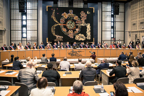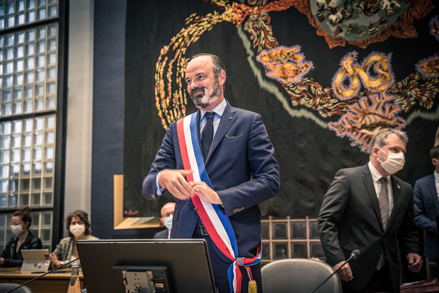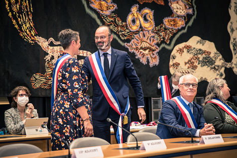 Edouard Philippe au conseil municipal, le Havre 2020. Echange des écharpes lors du conseil municipal Edouard philippe devient maire du Havre à nouveau.