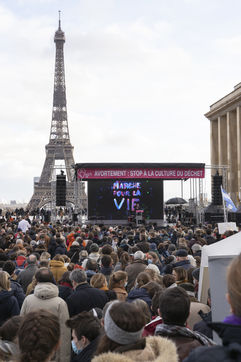 Dimanche 17 Janvier plusieurs milliers de personnes se sont rassemblées place du Trocadéro face à la Tour Eiffel à Paris, contre le projet de loi visant à rallonger la durée légale pour un possible IVG, avortement. Les pro-vies se sont donc rassemblés avec leurs masques de protection contre le Coronavirus, et une visioconférence zoom a aussi été organisée et retransmit sur écran géant.