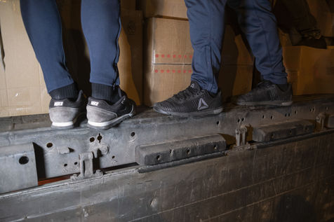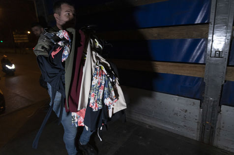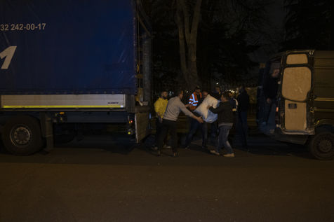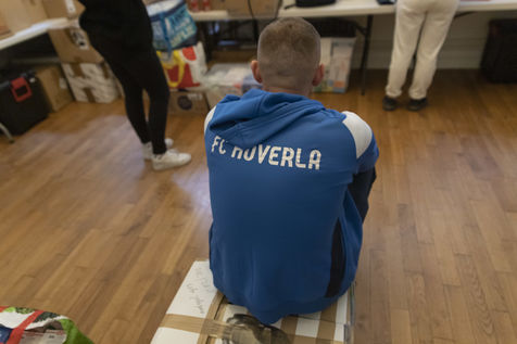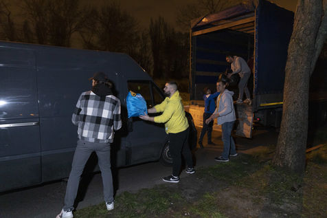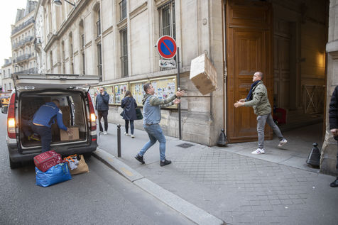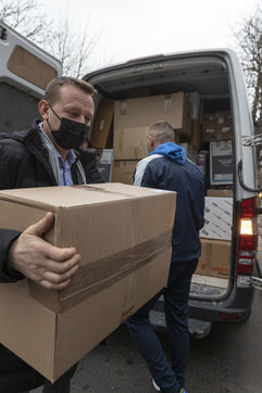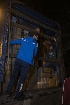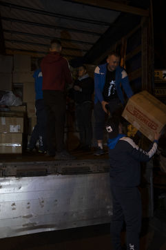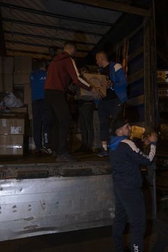 Cette salle va aussi leur servir de dépôt pour regrouper et centraliser tous les dons reçus à travers la France. Car aujourd'hui le camion envoyé par la diaspora est un peu plus gros que d'habitude. Effectivement c'est un vingt-quatre tonnes qui les attends sur les abords du périphérique parisien car trop volumineux pour rentrer dans la ville. Pendant près de deux heures la trentaine de jeunes présents charge ce camion, carton par carton en faisant une chaîne humaine. Tellement les dons ont afflué ces derniers jours, certains auront du mal à rentrer dans l'immense remorque. Mikhaylo à même du refuser deux camionnettes de 18m3 qui devait encore arriver de province. Mais ce n'est que partie remise pour un futur départ.