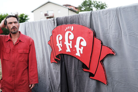 France, Aurillac, 2022-08-19. The Five foot fingers theater company returns to the Aurillac street theater festival to perform their show "en éventail" in 2022. I followed the troupe before and during their show.