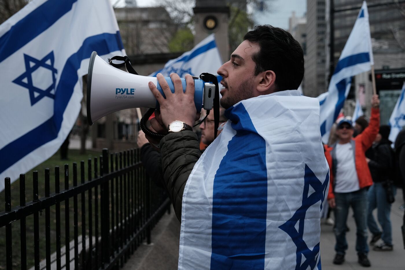 Canada, Montreal, 2 mai 2024, à l'université McGill, des étudiants activistes pro-palestiniens ont installé un camp sur le campus depuis cinq jours, à la suite d'une vague de protestations similaires dans les universités aux États-Unis. Des manifestants pro-israéliens ont organisé un contre-rassemblement près du camp. Photographie par Bastien Durand / Hans Lucas.