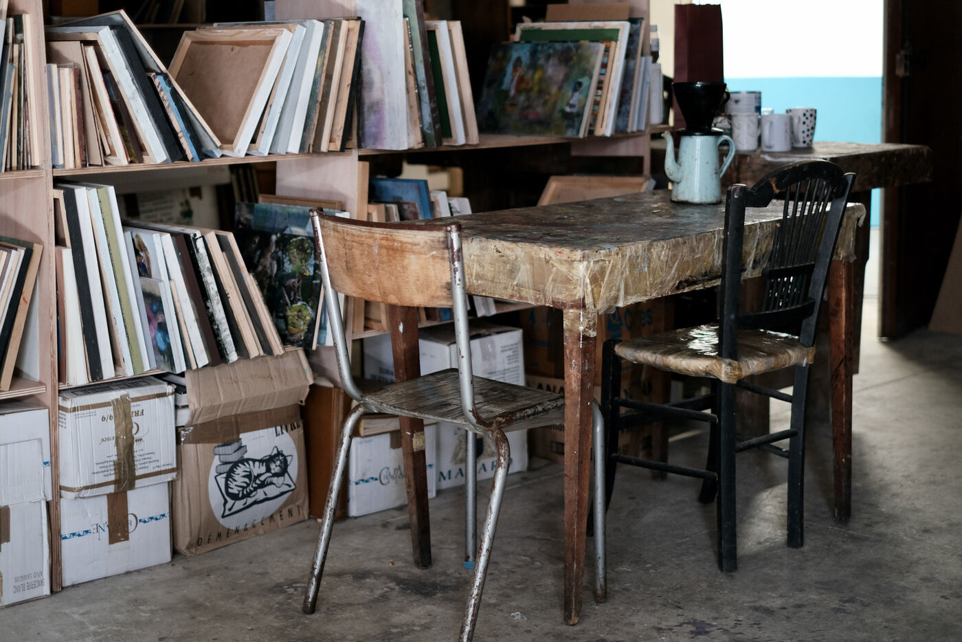 Au milieu, dans la lumière douce du début d'après midi, une table couverte de traces de peinture. prête à accueillir une recherche. Ou un café.