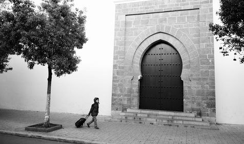 3. « Le petit chaperon rouge » : Une photo, pour moi, c'est avant tout une lumière. Quelle que soit la scène que mes yeux perçoivent je sais que je ne pourrai en rendre l'émotion qu'avec un éclairage qui la révèle et la mette en valeur. Il m'arrive donc de m'arrêter devant une lumière et d'attendre qu'un sujet se présente ; c'est ce qui s'est encore passé à l'occasion d'une de mes récentes randonnées casablancaises. Tôt un matin d'hiver, les premiers rayons de soleil lèchent les toits du quartier et leur lumière ne se propage dans les ruelles que sous une forme diffuse et diaphane, attribuant une présence quasi surnaturelle à cette porte de mosquée qui semble bondir hors de son mur blanc. Surgit alors cet écolier devenu à mes yeux un vrai petit chaperon rouge : il sort du bois et marche résolument sur le chemin du savoir malgré la menace béante et la noirceur du dogme ...