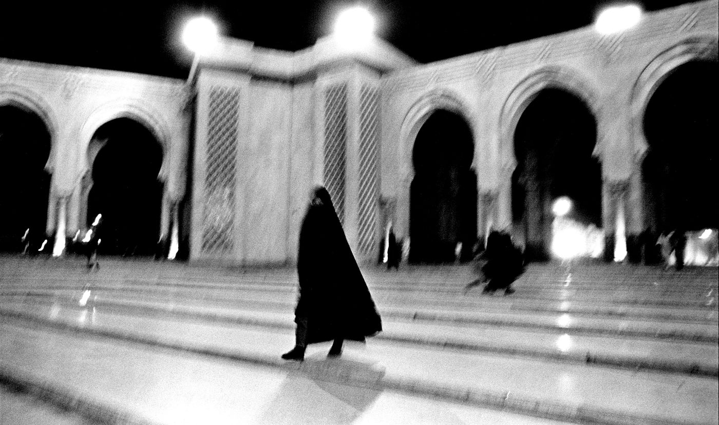 1. "Fear of the other": Our eyes perceive, our brains interpret, our morals judge... Casablanca on a winter evening on the esplanade of the Great Hassan II Mosque. She arrived and rushed down the stairs. I saw her, she marked me, I photographed her. The image obtained pleased me as soon as it came out of the developer, I showed it and even ha dit exhibited. But even today I still can't clarify what it evokes in me: fascination, misunderstanding, fear? And when the time came to legend it, my contradictory reactions appeared in the open: "The flight of the raven" or "The wings of faith"? Or simply "Freedom to be"? But how far can we talk about freedom of being? Could freedom of not being exist... This idea frightens me.