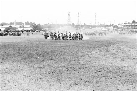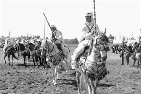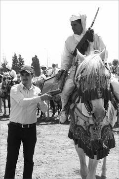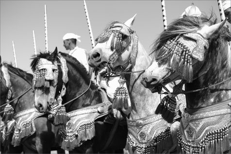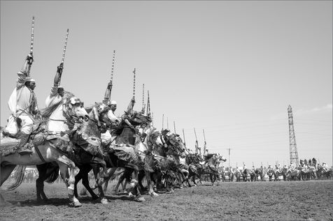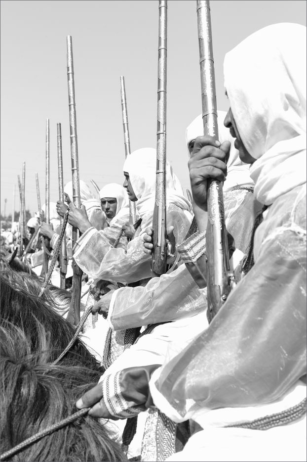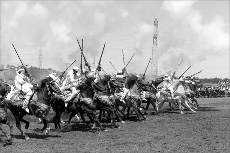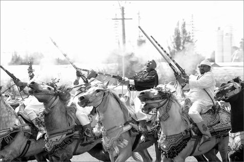 « The fantasia / tbourida (baroud means gunpowder) is a traditional equestrian art practiced in the Maghreb, manifested by the simulation of military assaults. It most often takes the form of equestrian evolutions during which riders, equipped with black powder rifles and riding richly harnessed horses, simulate a cavalry charge which ends with the coordinated firing of a salvo of their firearms. " (Wikipedia)