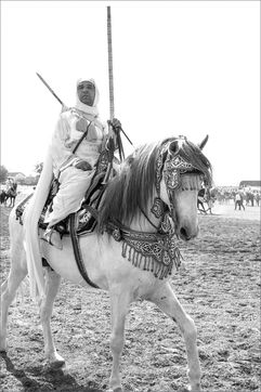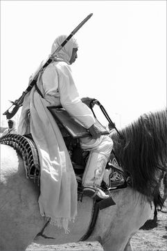 « La fantasia / tbourida (de baroud, la poudre à canon) est un art équestre traditionnel pratiqué au Maghreb se manifestant par la simulation d'assauts militaires. Elle prend le plus souvent la forme d'évolutions équestres au cours desquelles des cavaliers, munis de fusils à poudre noire et chevauchant des montures richement harnachées, simulent une charge de cavalerie dont l'apothéose est le tir coordonné d'une salve de leurs armes à feu. » (Wikipedia)