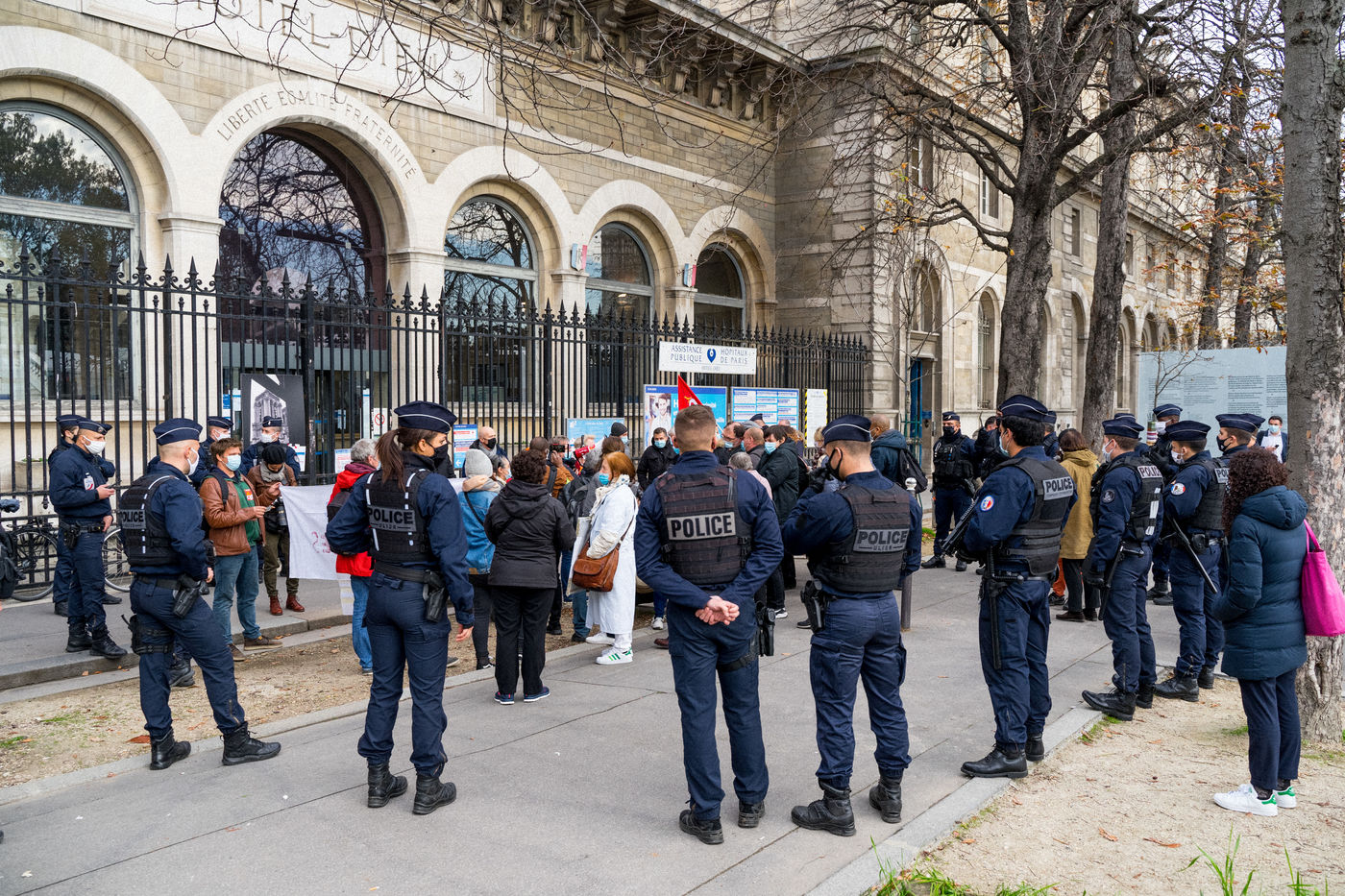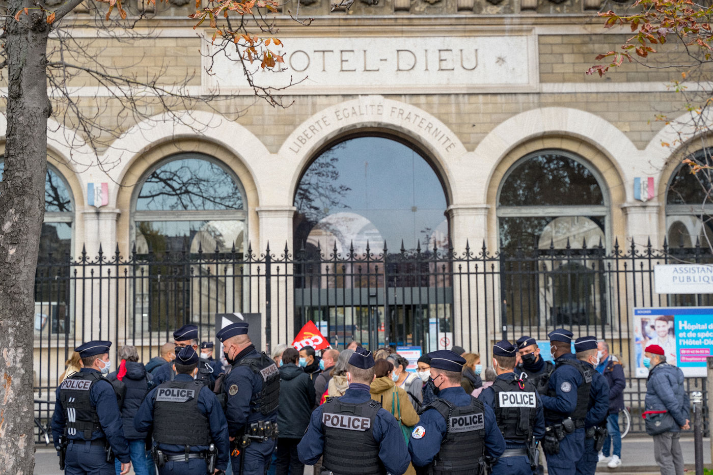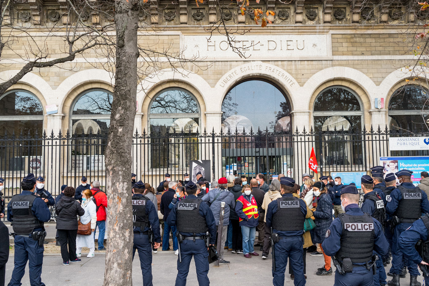 Several dozen demonstrators gathered on November 6, 2020 in front of the Hôtel-Dieu to protest against the decision of the Assistance publique - Hôpitaux de Paris (AP-HP) to "temporarily halt" the emergency services of this establishment