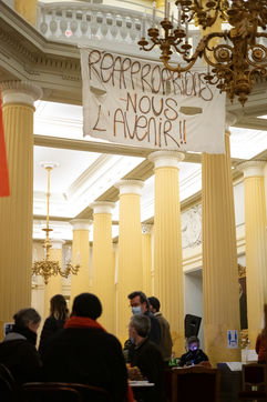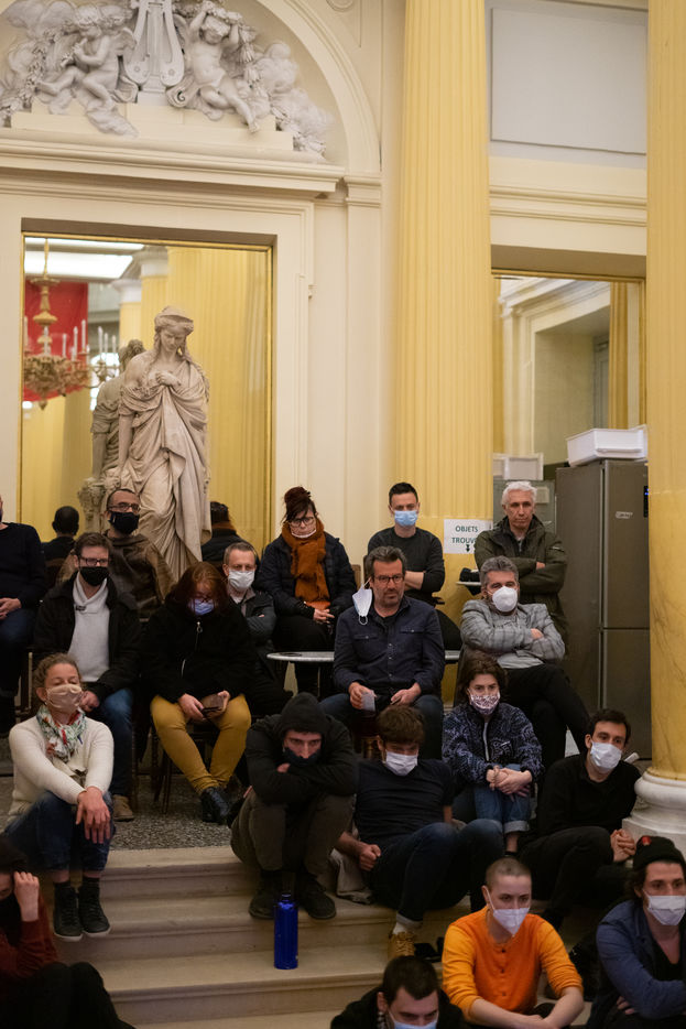 David Dufresne, accompanied by the journalist Taha Bouahfs, organized a clandestine screening of his film Un pays qui se tient sage in the very heart of the Odeon theatre, still occupied by the intermittent workers. The latter claim more rights while the cinema, the places of culture and spectacle are always closed because of confinement.