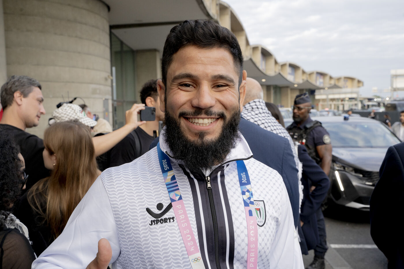 Roissy-en-France, France, le 25 juillet 2024 Accueil d?une partie des huit athlètes palestiniens en lice pour une médaille olympique aux Jeux Olympiques 2024 à Paris, à l?aéroport de Paris-Charles de Gaulle ce jeudi 25 juillet à l?aube.