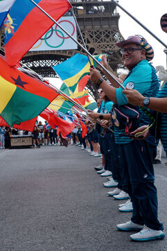 Tour Eiffel - Paris - France, volunteers gather for a grand parade in Olympic colours one year after the opening ceremony of the 2024 Olympic Games.