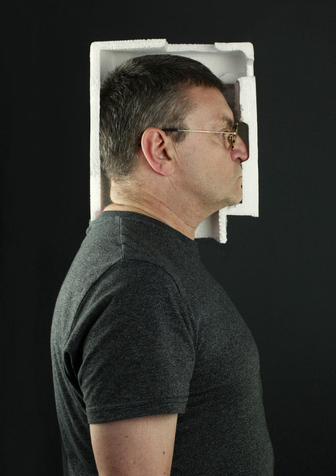 Fasciné par le mystère dégagé par chaque visage, j'ai utilisé le mien comme un outil dans l'élaboration de ces autoportraits. Comme pour un menu « retour du marché » quand le cuisinier se laisse guider par les produits achetés, j'ai concocté chaque image en partant de la réalité de l'objet récolté. Pas d'idées arrêtées au départ de la construction de l'image mais une recherche un tâtonnement et des essais multiples. J'ai travaillé, seul, sans voir ce que je photographiai exactement, je n'ai pas utilisé d'écran de contrôle, quand j'appuyais sur la télécommande radio pour déclencher, je laissais la place au hasard et à l'imprévu. Souvent j'ai été surpris, voire effrayé, par le résultat.