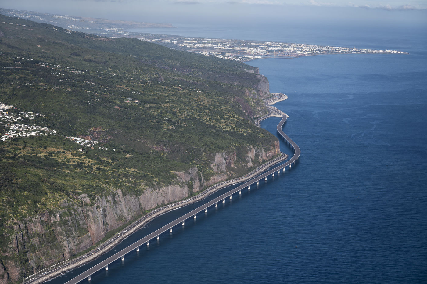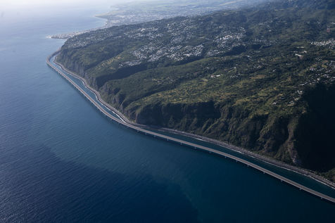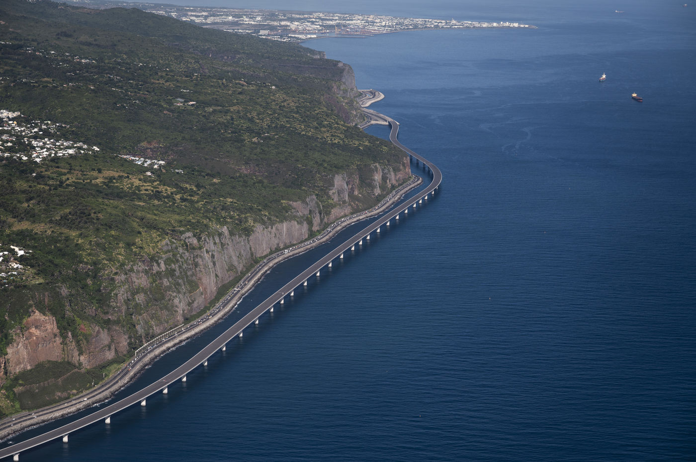 Aerial views of the New Coastal Road, NCR, on which work began in 2014. The viaduct section between Saint-Denis and Grande Chaloupe is completed, while the dike between Grande Chaloupe and La Possession is currently under construction, as is the Saint-Denis interchange. Currently the delivery date of the structure is scheduled for 2023, in the absence of new adventures.