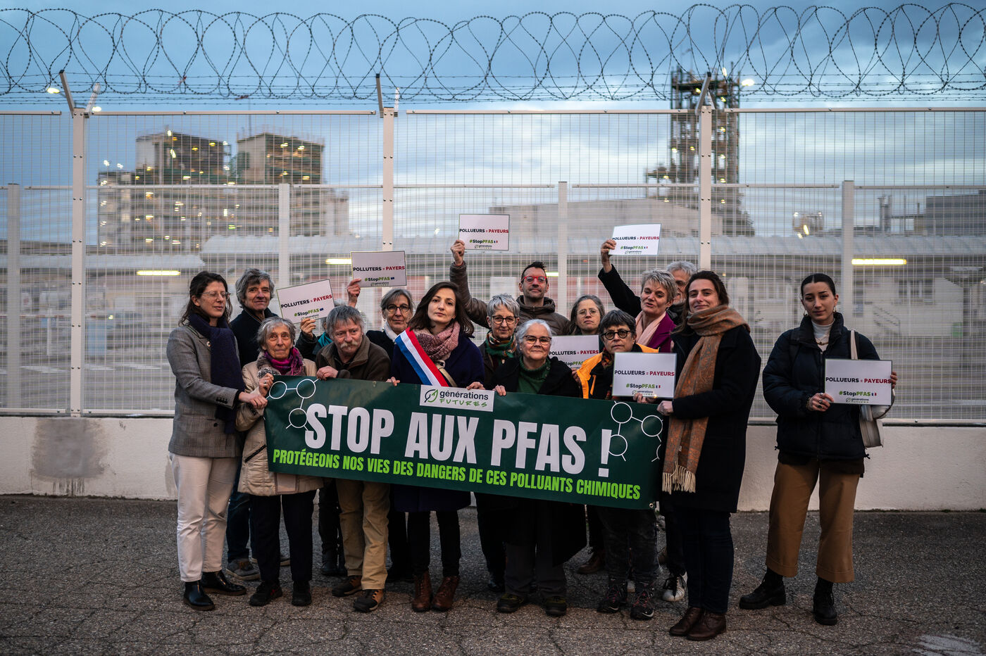 Ecologists, activists from Générations Futures and Notre Affaire à Tous, gathered in front of the Arkema chemical platform in Oullins-Pierre-Bénite, with a banner reading ‘STOP AUX PFAS! LET'S PROTECT OUR LIVES FROM THE DANGERS OF THESE CHEMICAL POLLUTANTS’. In the presence of Marine Tondelier, national secretary of Les Ecologistes, carrying a ‘POLLUTERS=PAYEURS’ placard, and Marie-Charlotte Garin, member of parliament, before the PFAS law was again put through the National Assembly.
