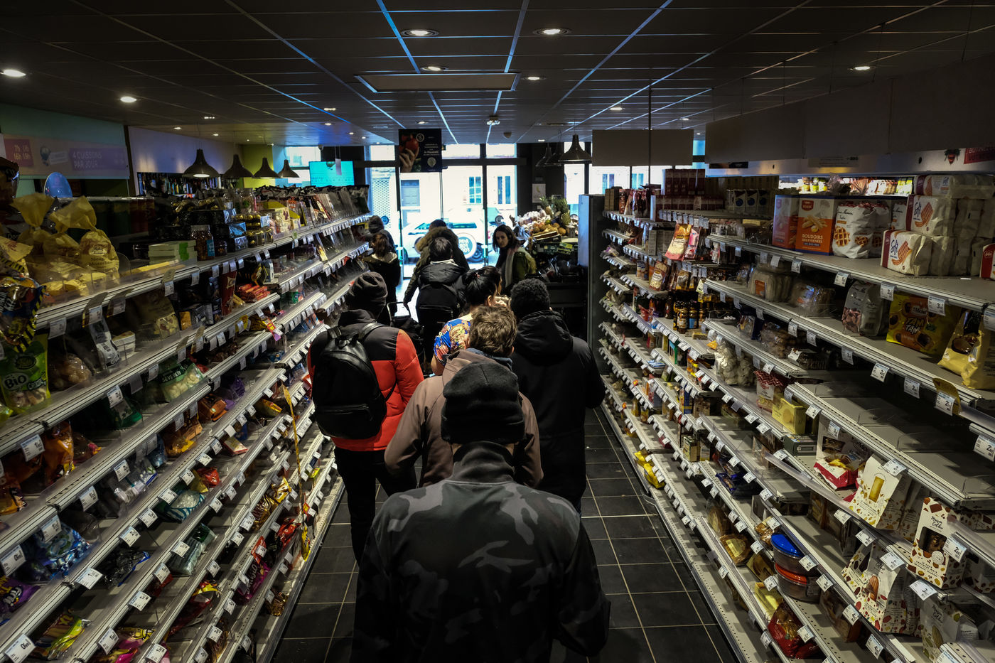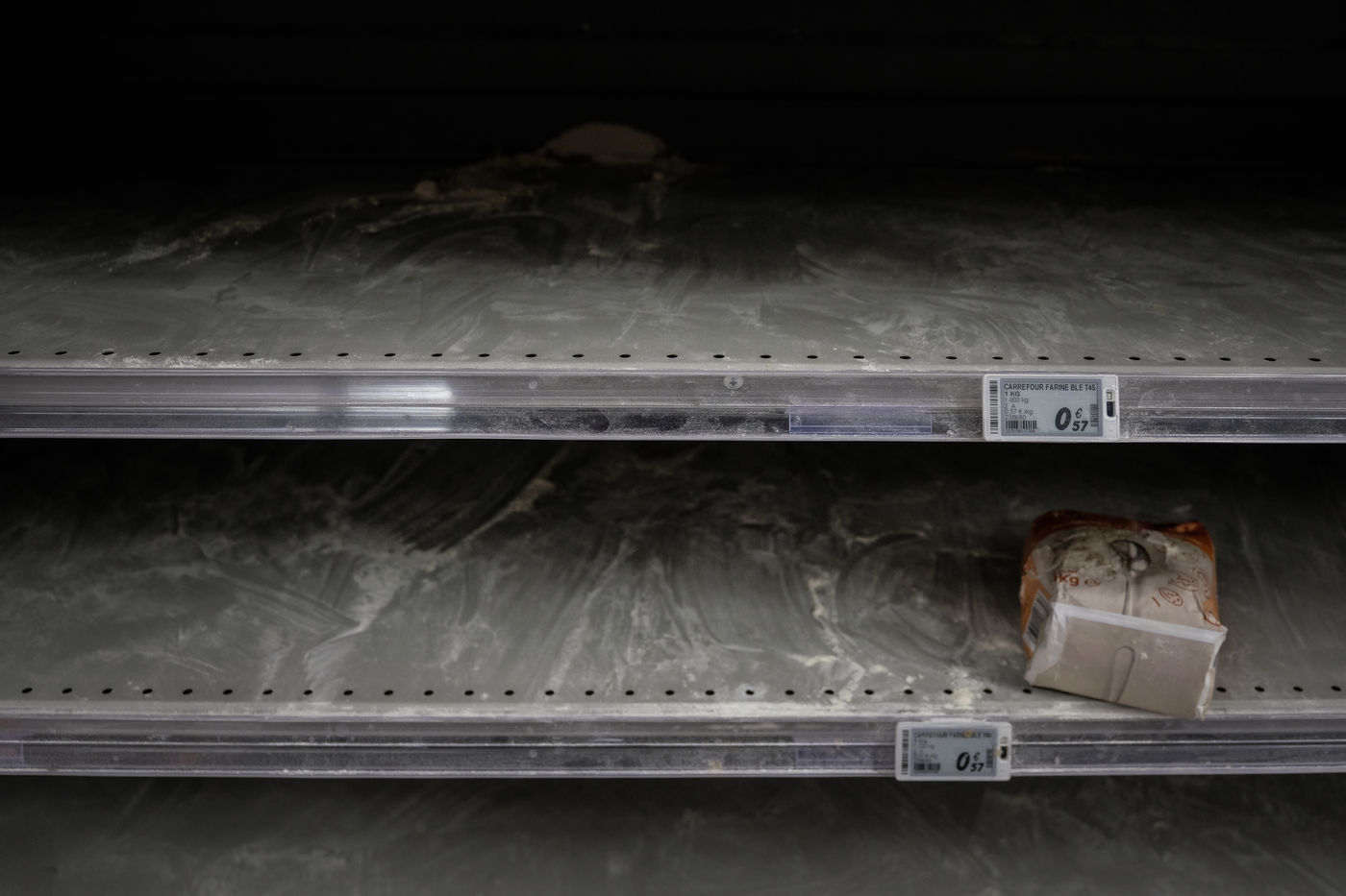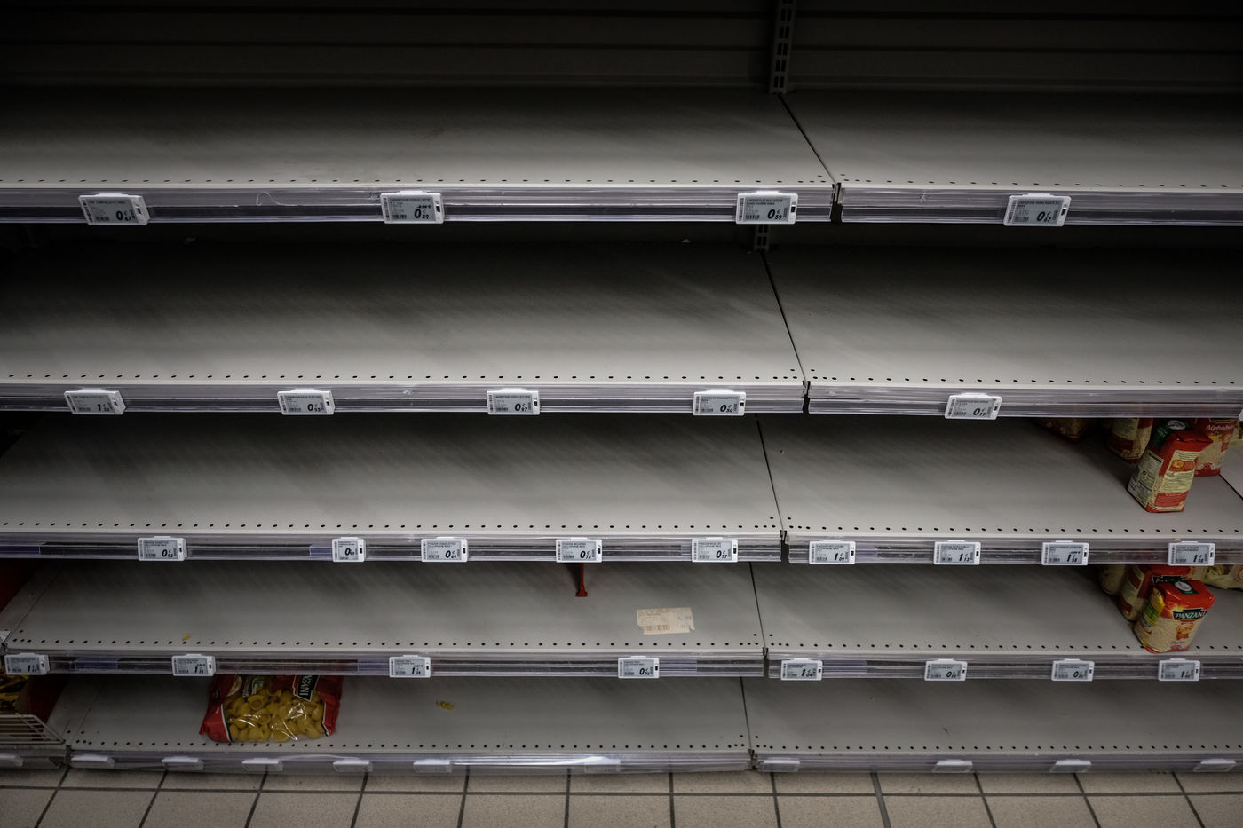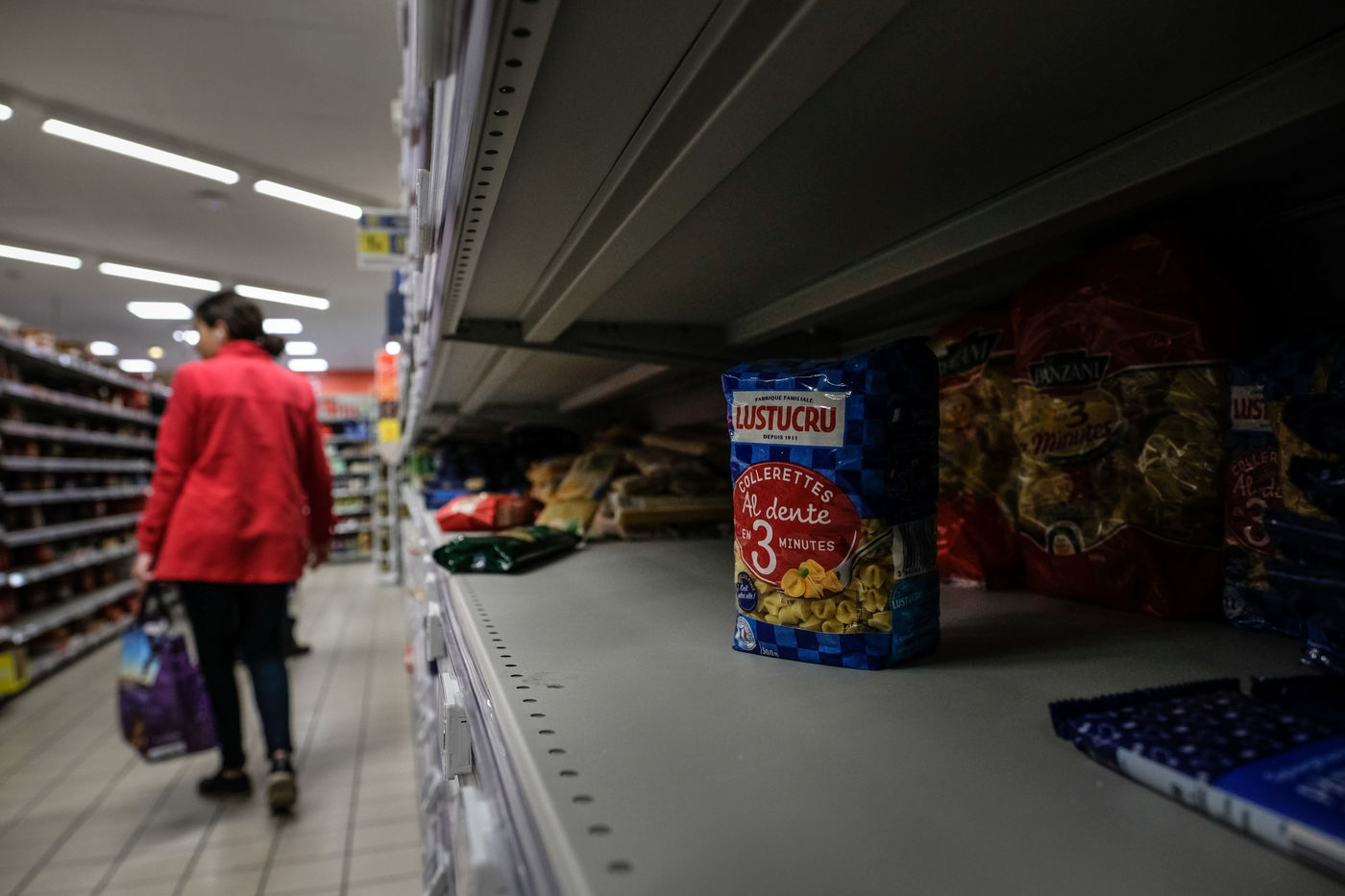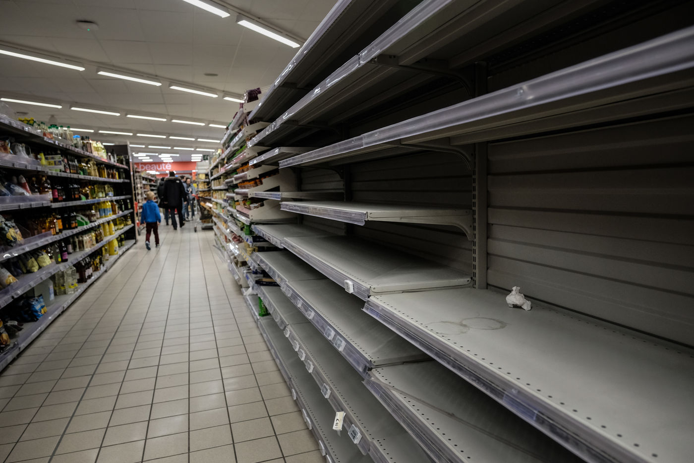 Dans les magasins les produits de premiere necessites sont pris d assaut laissant les rayons vides et saccages. Pattes, riz, sucre, farine, oeuf, lait, produit menage, papier-toilette.