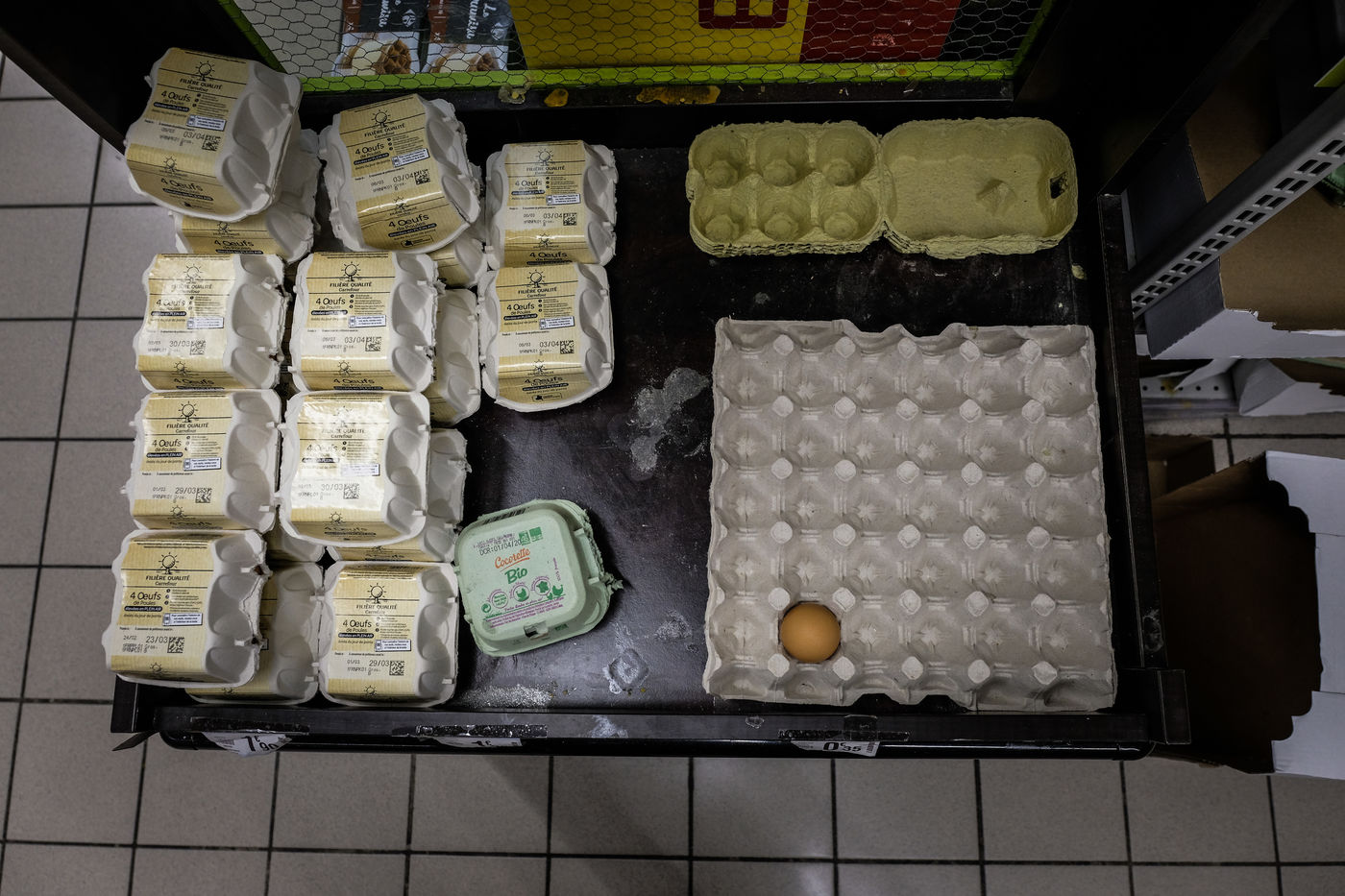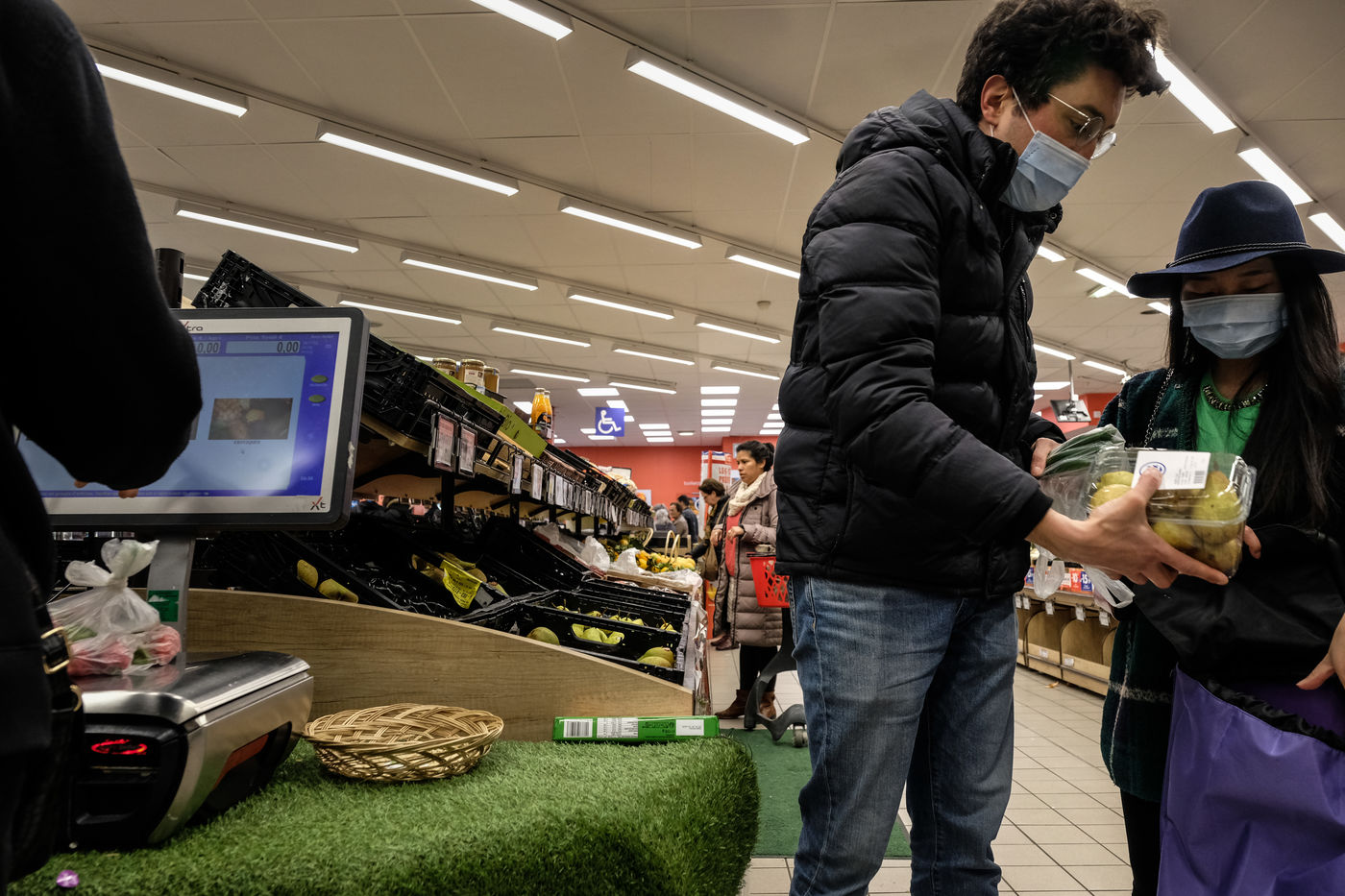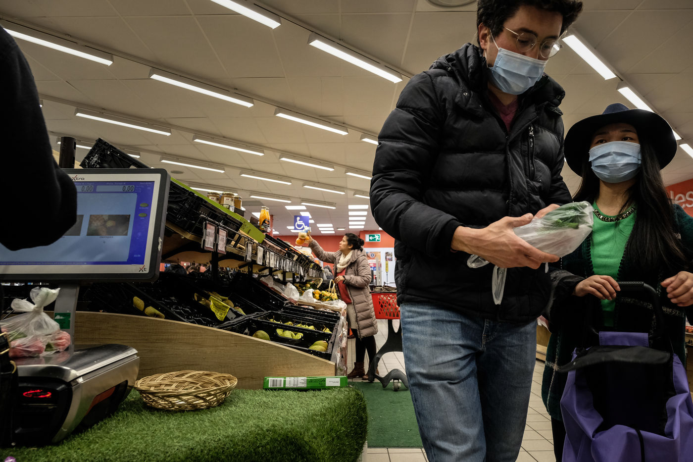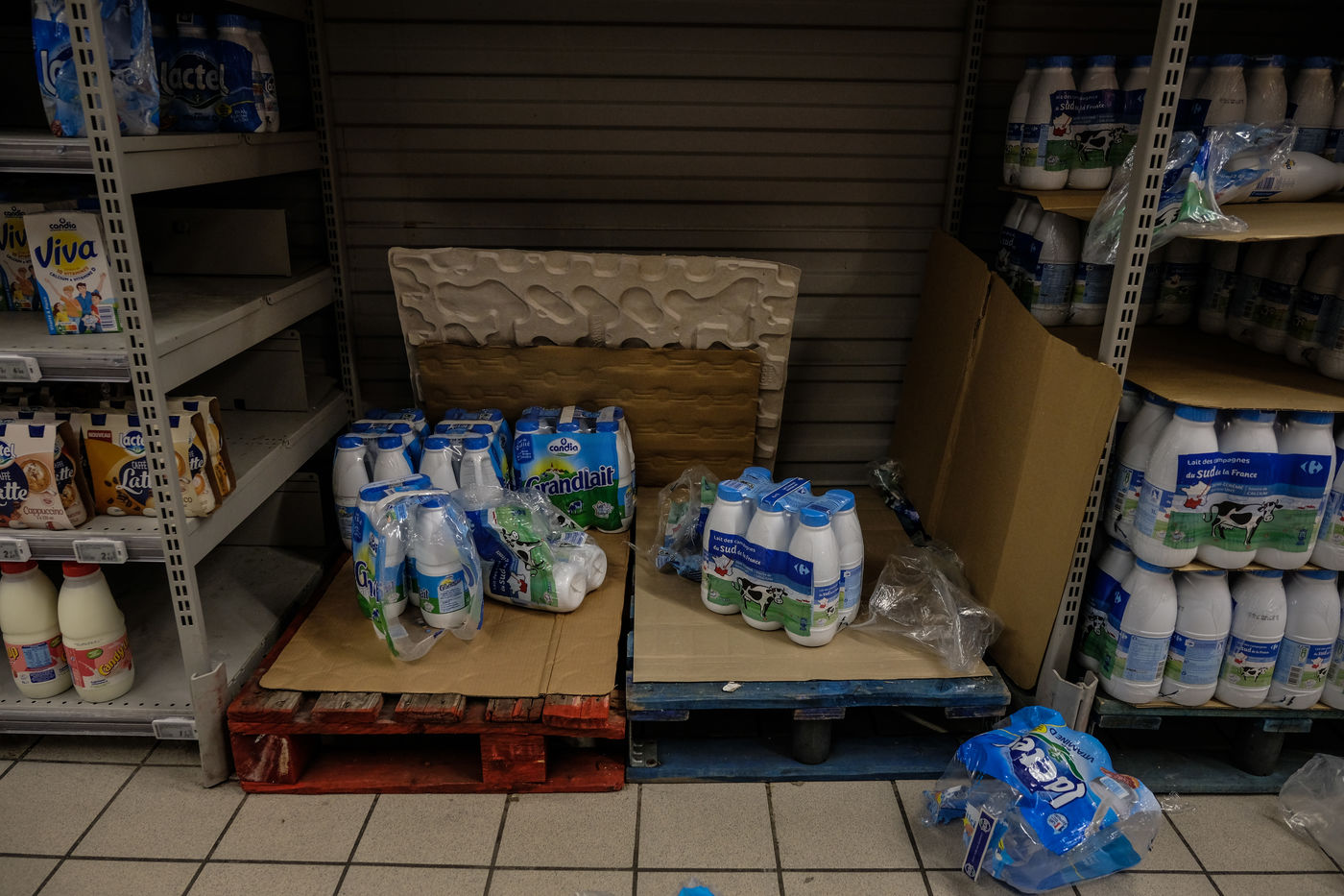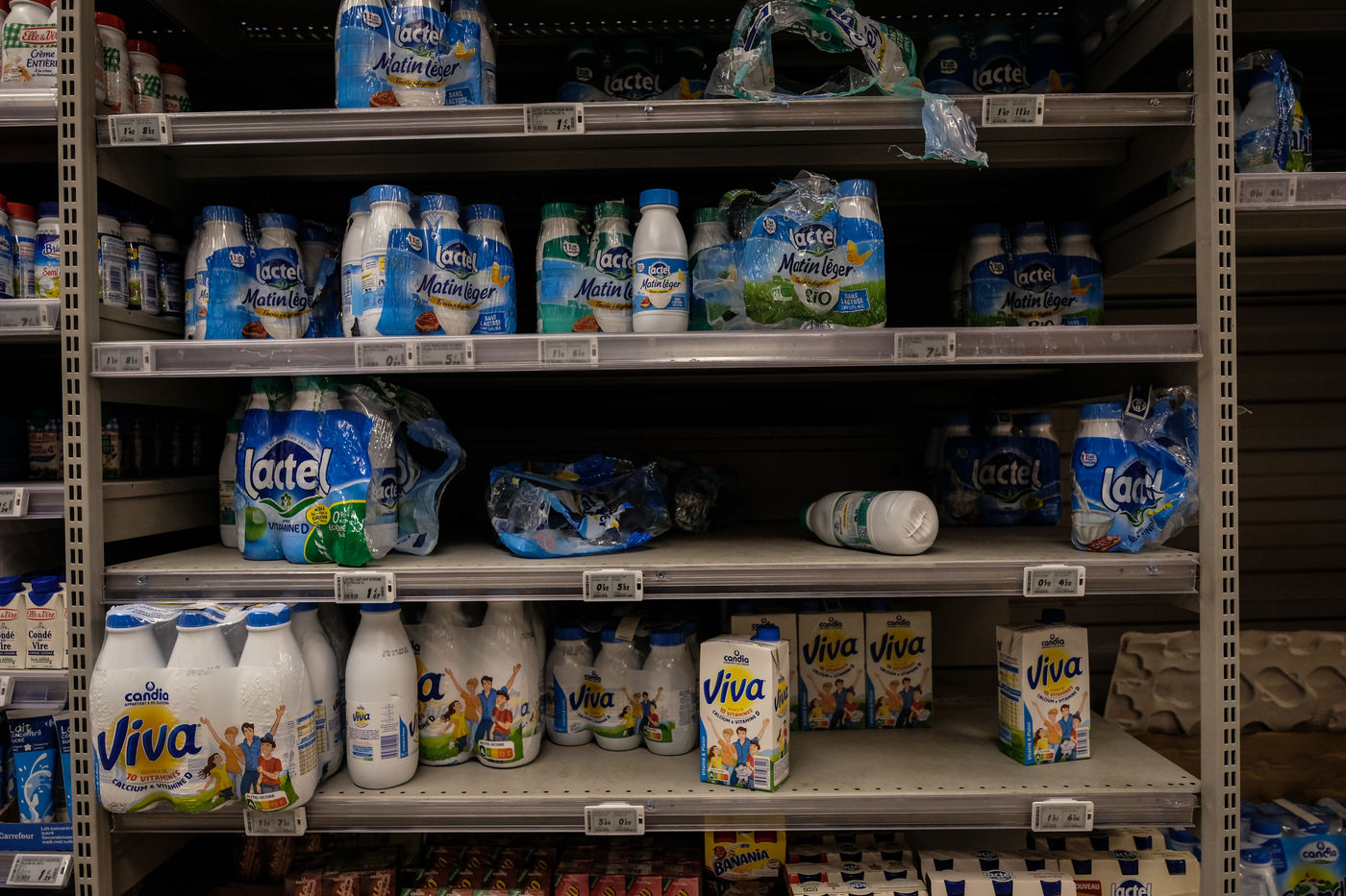 Dans les magasins les produits de premiere necessites sont pris d assaut laissant les rayons vides et saccages. Pattes, riz, sucre, farine, oeuf, lait, produit menage, papier-toilette.