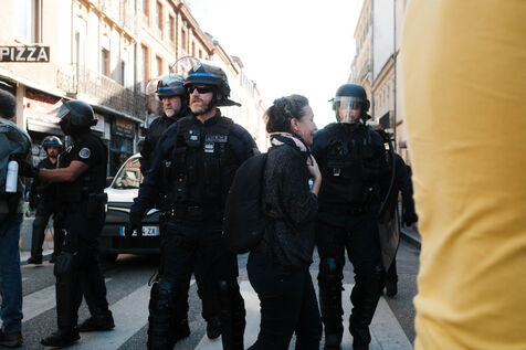 Toulouse, September 18, 2025 — Protesters take part in the symbolic action called Operation Duck, repeatedly crossing a pedestrian crossing in the Saint Cyprien district to disrupt traffic, as part of the national day of social mobilization.