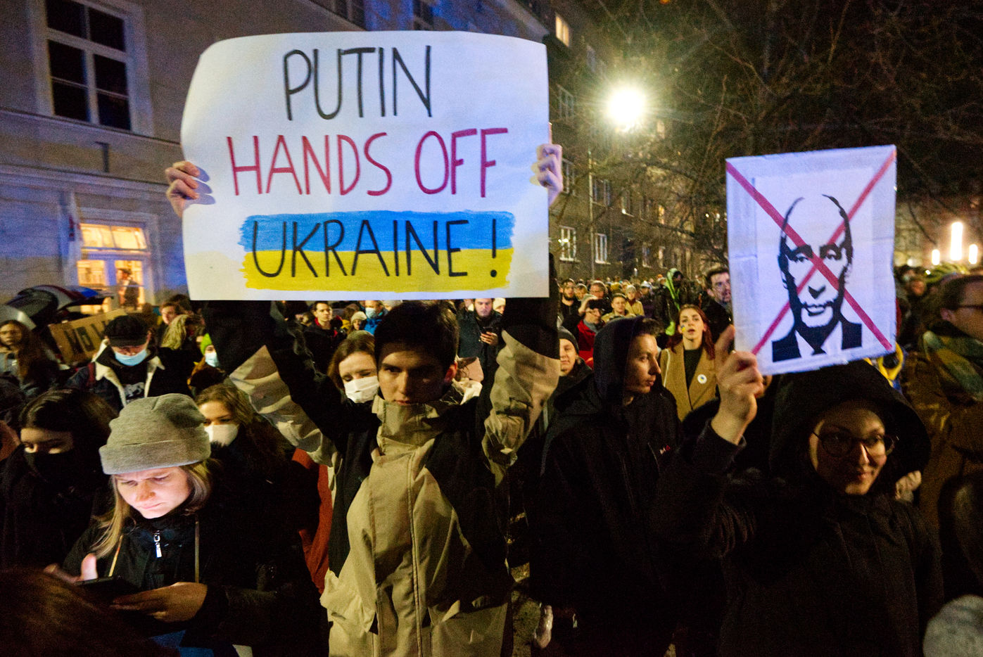 Hundreds of Ukrainians and Poles protest outside the Russian consulate in Krakow, Poland as Russia invades Ukraine - Krakow, Poland, February 24 2022.