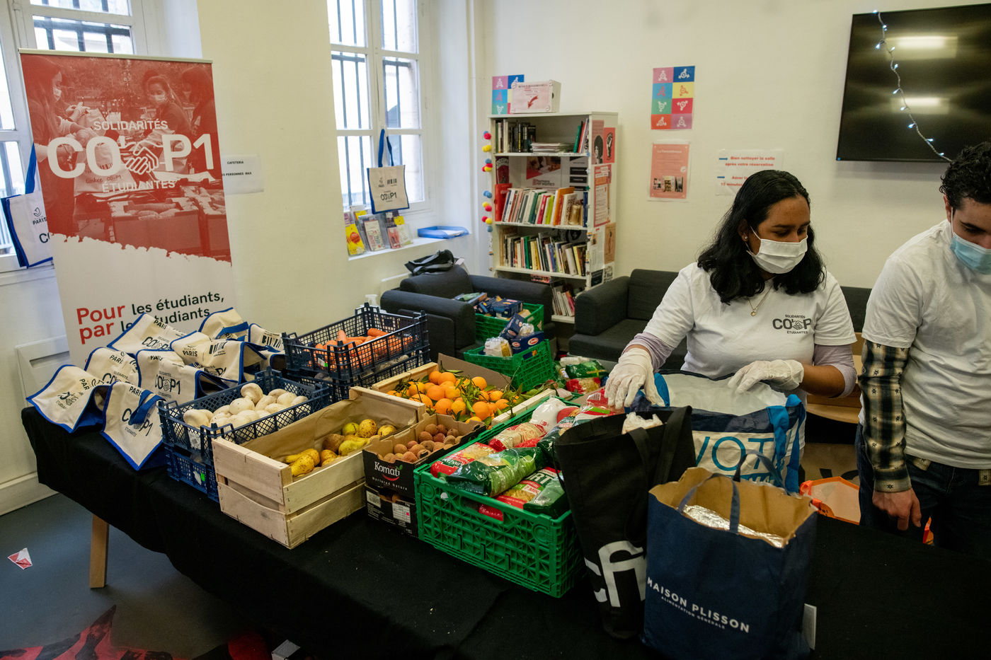 Paris, France le 30 Janvier 2021 : Des benevoles membres de l association COP1 et SONU (Sorbonne pour l Organisation des Nations Unies) organisent une distribution alimentaire gratuite pour les etudiants.