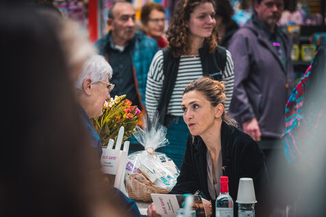 Julie Gayet et l ancien president francais Francois Hollande rencontre des lecteurs et des admirateurs lors d une seance de dedicace de son livre Bouleversements dans une librairie de la ville d Ares, dans le sud-ouest de la France, le 15 avril 2023.