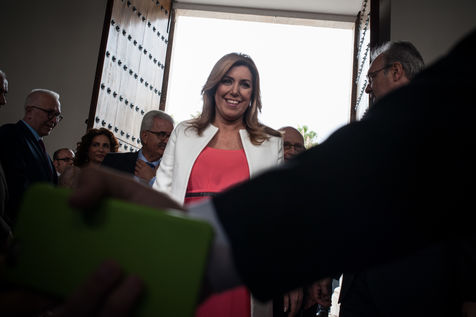 Investiture de la présidente de la région autonome d'Andalousie, Susana Diaz, en présence de l'ex-premier ministre espagnol José Luis Rodriguez Zapatero et du nouveau leader socialiste Pedro Sanchez. Numéro deux du PSOE (parti socialiste Espagnol), Mme Diaz est réelue pour un second mandat à la tête de l'Andalousie (historiquement trés encrée à gauche), malgré de nombreuses critiques et accusations de corruption et conflits d'intêret et un chômage dans la région qui frôle les 27%