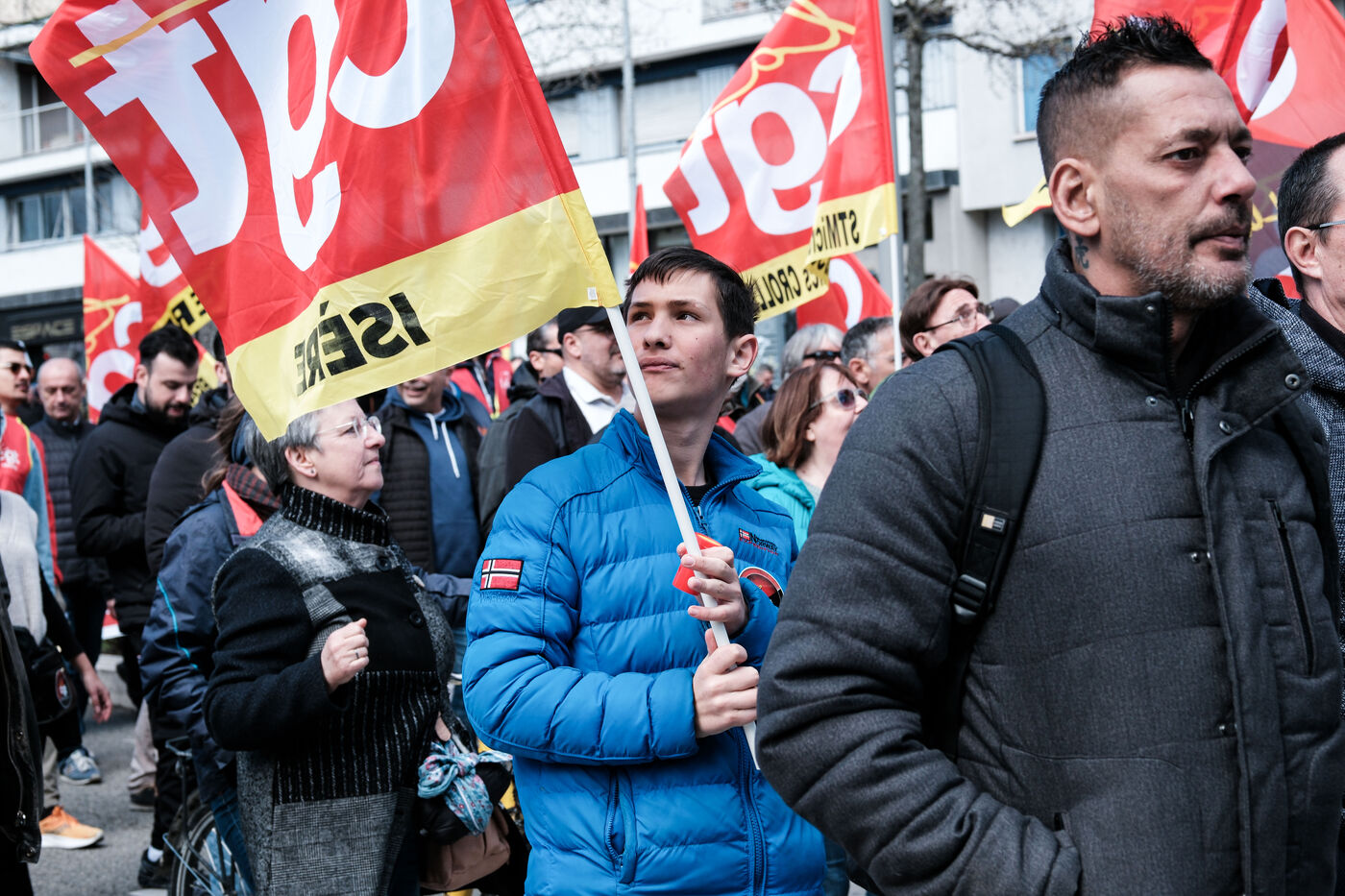 Le poing levé : pour la huitième fois depuis le 19 janvier, premier acte de la contestation, des milliers de personnes manifesté dans les rues de Grenoble à l'appel des syndicats pour protester contre la réforme des retraites du Gouvernement.