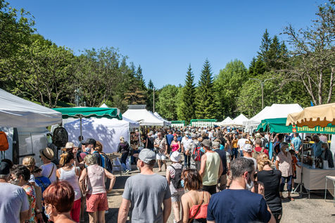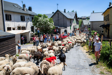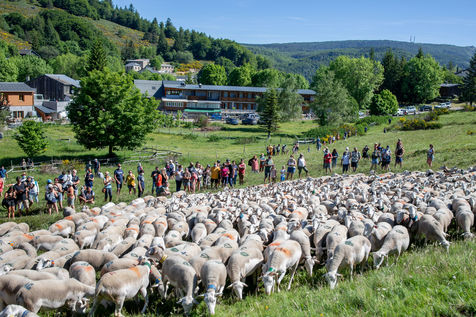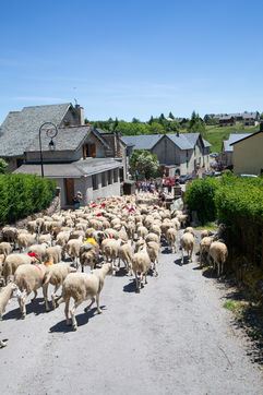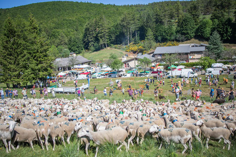 Fête traditionnelle de la transhumance estivale dans le village de L'Espérou (Gard), sur le massif de l'Aigoual. Dimanche 13 juin 2021. Les troupeaux en pâture dans les vallées l'hiver rejoignent les montagnes pendant l'estive. Ici, plusieurs troupeaux arrivent et sont célébrés par des centaines de locaux. Un marché de producteurs et des animations sont aussi au programme de la journée.