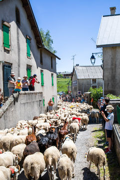Traditional festival of the summer transhumance in the village of L'Espérou (Gard), on the massif of Aigoual. Sunday June 13, 2021. The herds grazing in the valleys in winter join the mountains during the summer. Here, several herds arrive and are celebrated by hundreds of locals. A producers' market and animations are also on the program of the day.