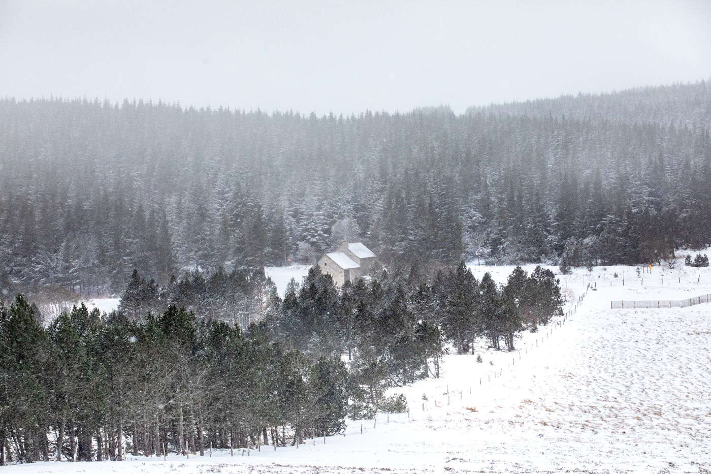 La neige s'invite peu à peu dans les Cévennes en Lozère. L'occasion de (re)découvrir les paysages hivernaux. 5 décembre 2021.