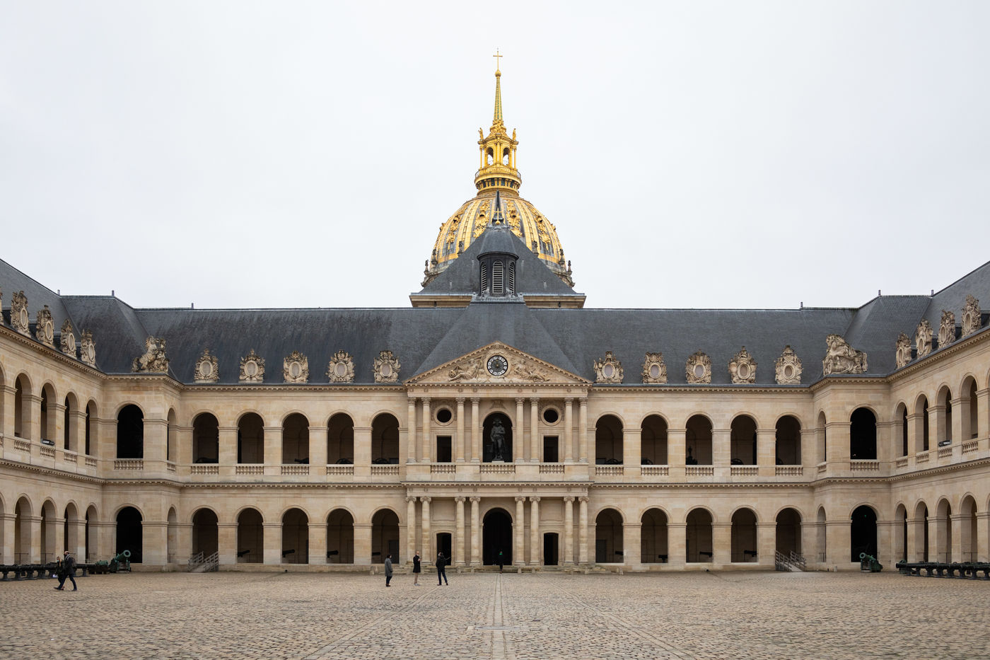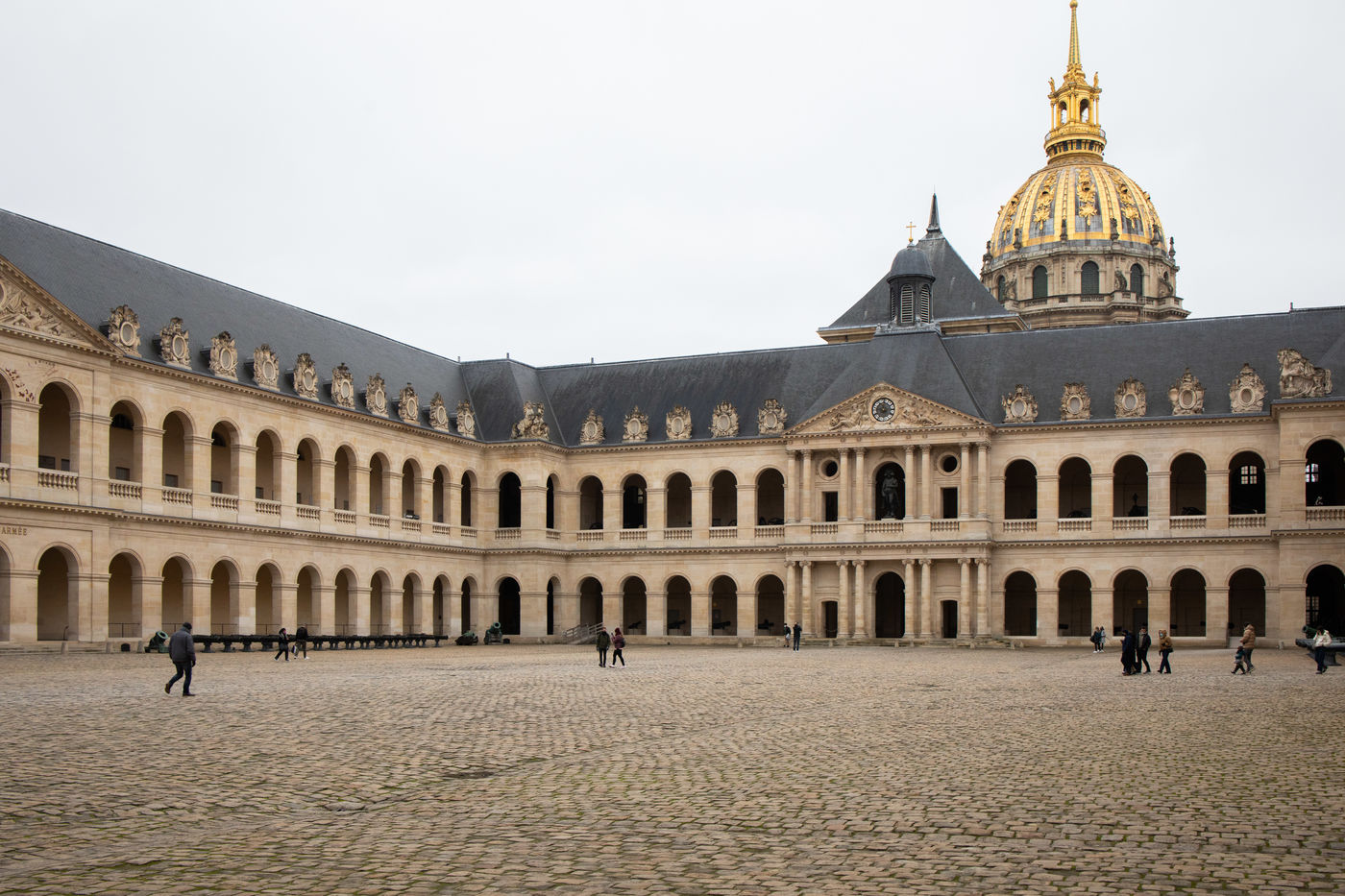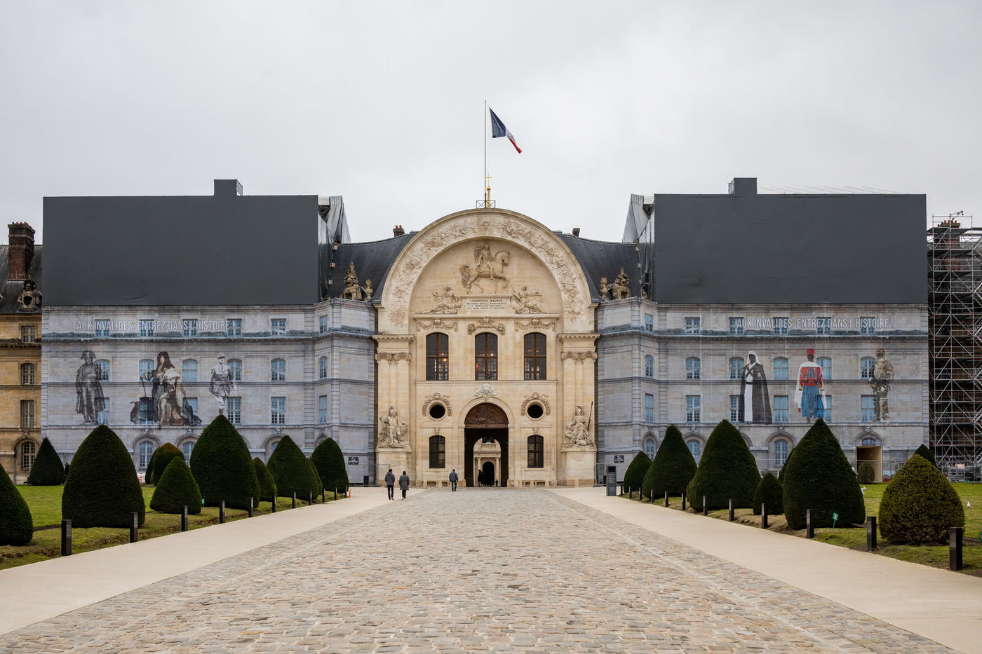 L'hôtel national des Invalides à Paris, est un bâtiment en l'honneur des forces armées. Il est construit en 1670 sous l'impulsion de Louis XIV. Illustrations du bâtiment et de la cour d'honneur, janvier 2022.