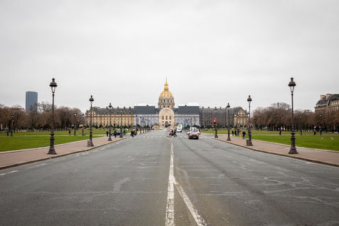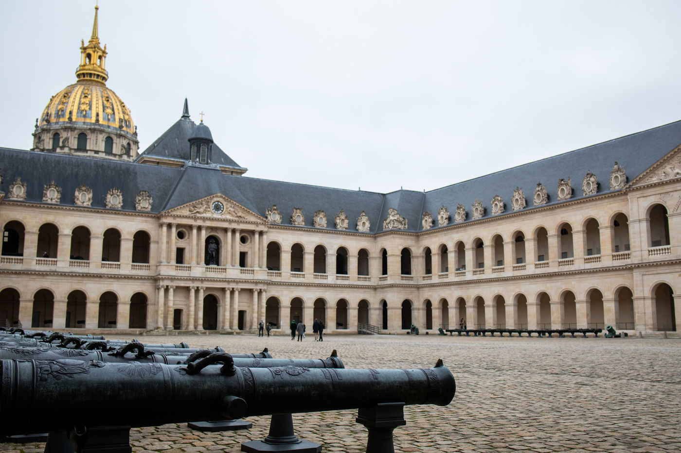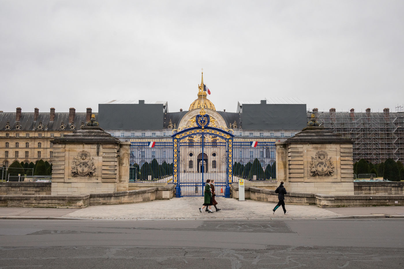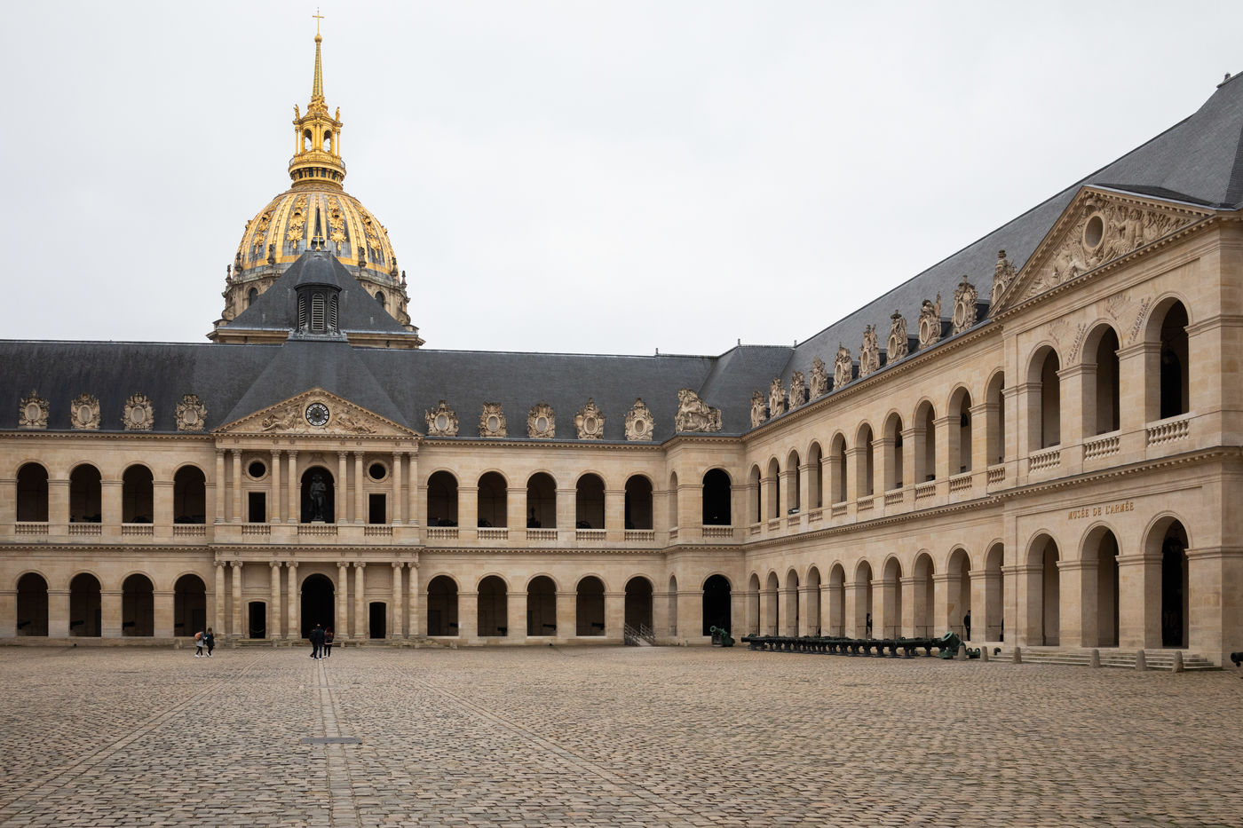 L'hôtel national des Invalides à Paris, est un bâtiment en l'honneur des forces armées. Il est construit en 1670 sous l'impulsion de Louis XIV. Illustrations du bâtiment et de la cour d'honneur, janvier 2022.